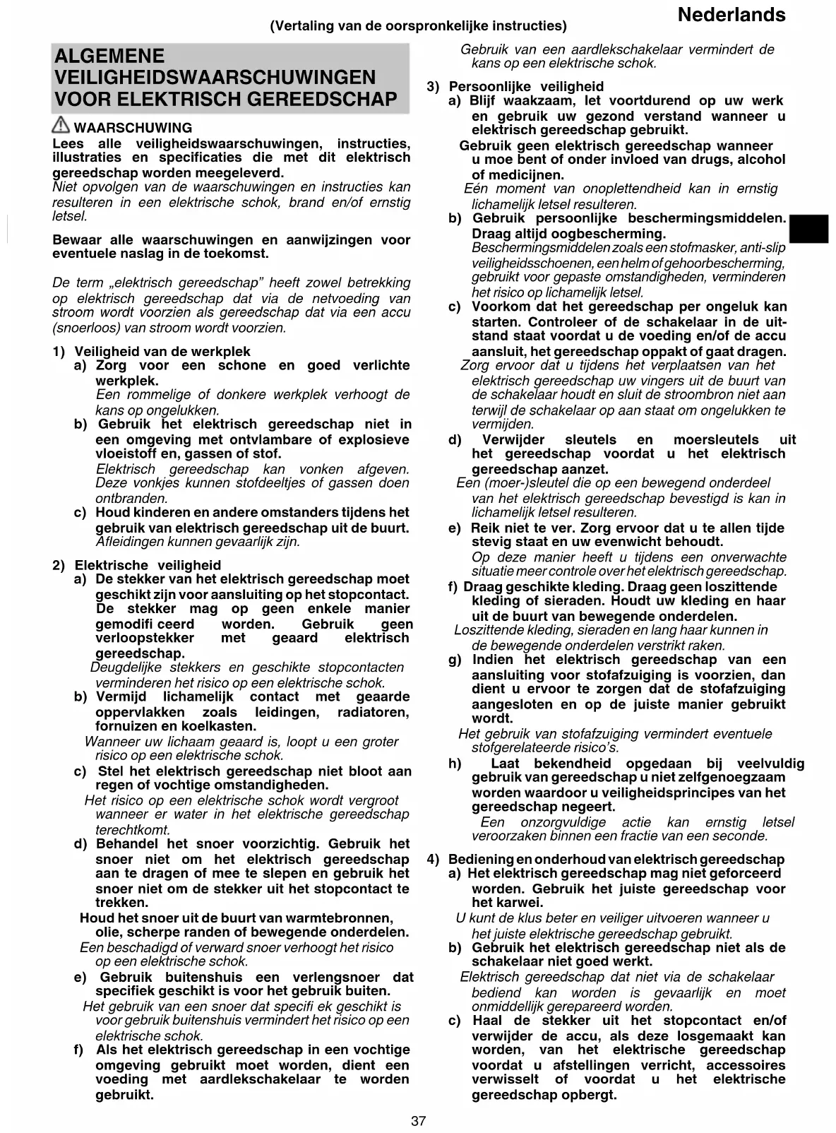 Bediening en onderhoud van elektrisch gereedschap a) Het elektrisch gereedschap mag niet geforceerd worden. Gebruik het juiste gereedschap voor het karwei. U kunt de klus beter en veiliger uitvoeren wanneer u het juiste elektrische gereedschap gebruikt. b) Gebruik het elektrisch gereedschap niet als de schakelaar niet goed werkt. Elektrisch gereedschap dat niet via de schakelaar bediend kan worden is gevaarlijk en moet onmiddellijk gerepareerd worden. c) Haal de stekker uit het stopcontact en/of verwijder de accu, als deze losgemaakt kan worden, van het elektrische gereedschap voordat u afstellingen verricht, accessoires verwisselt of voordat u het elektrische gereedschap opbergt. ALGEMENE VEILIGHEIDSWAARSCHUWINGEN