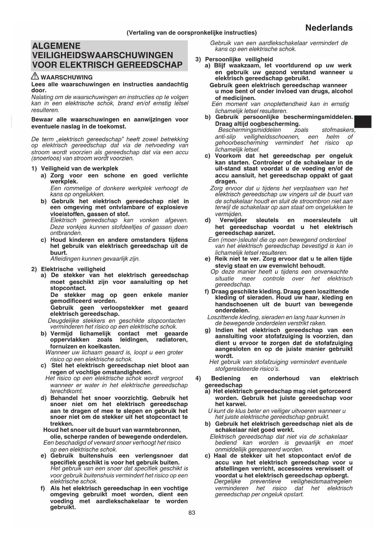 WAARSCHUWING Lees alle waarschuwingen en instructies aandachtig door. Nalating om de waarschuwingen en instructies op te volgen kan in een elektrische schok, brand en/of ernstig letsel resulteren. Bewaar alle waarschuwingen en aanwijzingen voor eventuele naslag in de toekomst. De term „elektrisch gereedschap” heeft zowel betrekking op elektrisch gereedschap dat via de netvoeding van stroom wordt voorzien als gereedschap dat via een accu (snoerloos) van stroom wordt voorzien.