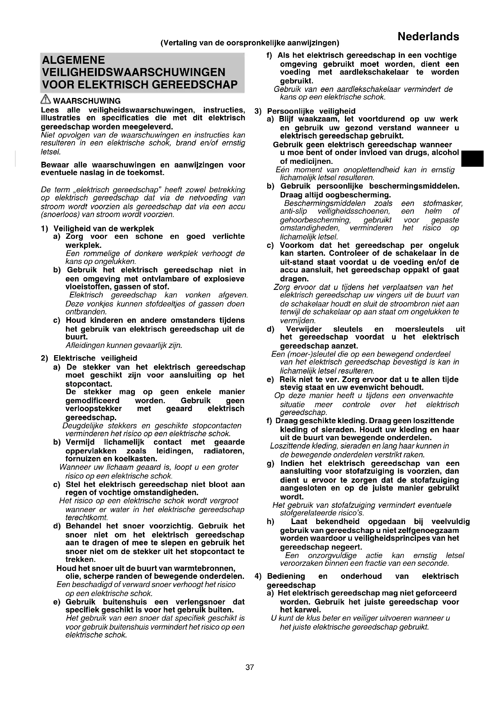 a) Blijf waakzaam, let voortdurend op uw werk en gebruik uw gezond verstand wanneer u elektrisch gereedschap gebruikt. Gebruik geen elektrisch gereedschap wanneer u moe bent of onder invloed van drugs, alcohol of medicijnen. Eén moment van onoplettendheid kan in ernstig lichamelijk letsel resulteren. b) Gebruik persoonlijke beschermingsmiddelen. Draag altijd oogbescherming. Beschermingsmiddelen zoals een stofmasker, anti-slip veiligheidsschoenen, een helm of gehoorbescherming, gebruikt voor gepaste omstandigheden, verminderen het risico op lichamelijk letsel. c) Voorkom dat het gereedschap per ongeluk kan starten. Controleer of de schakelaar in de uit-stand staat voordat u de voeding en/of de accu aansluit, het gereedschap oppakt of gaat dragen. Zorg ervoor dat u tijdens het verplaatsen van het elektrisch gereedschap uw vingers uit de buurt van de schakelaar houdt en sluit de stroombron niet aan terwijl de schakelaar op aan staat om ongelukken te vermijden. d) Verwijder sleutels en moersleutels uit het gereedschap voordat u het elektrisch gereedschap aanzet. Een (moer-)sleutel die op een bewegend onderdeel van het elektrisch gereedschap bevestigd is kan in lichamelijk letsel resulteren. e) Reik niet te ver. Zorg ervoor dat u te allen tijde stevig staat en uw evenwicht behoudt. Op deze manier heeft u tijdens een onverwachte situatie meer controle over het elektrisch gereedschap. f) Draag geschikte kleding. Draag geen loszittende kleding of sieraden. Houdt uw kleding en haar uit de buurt van bewegende onderdelen. Loszittende kleding, sieraden en lang haar kunnen in de bewegende onderdelen verstrikt raken. g) Indien het elektrisch gereedschap van een aansluiting voor stofafzuiging is voorzien, dan dient u ervoor te zorgen dat de stofafzuiging aangesloten en op de juiste manier gebruikt wordt. Het gebruik van stofafzuiging vermindert eventuele stofgerelateerde risico’s. h) Laat bekendheid opgedaan bij veelvuldig gebruik van gereedschap u niet zelfgenoegzaam worden waardoor u veiligheidsprincipes van het gereedschap negeert. Een onzorgvuldige actie kan ernstig letsel veroorzaken binnen een fractie van een seconde.