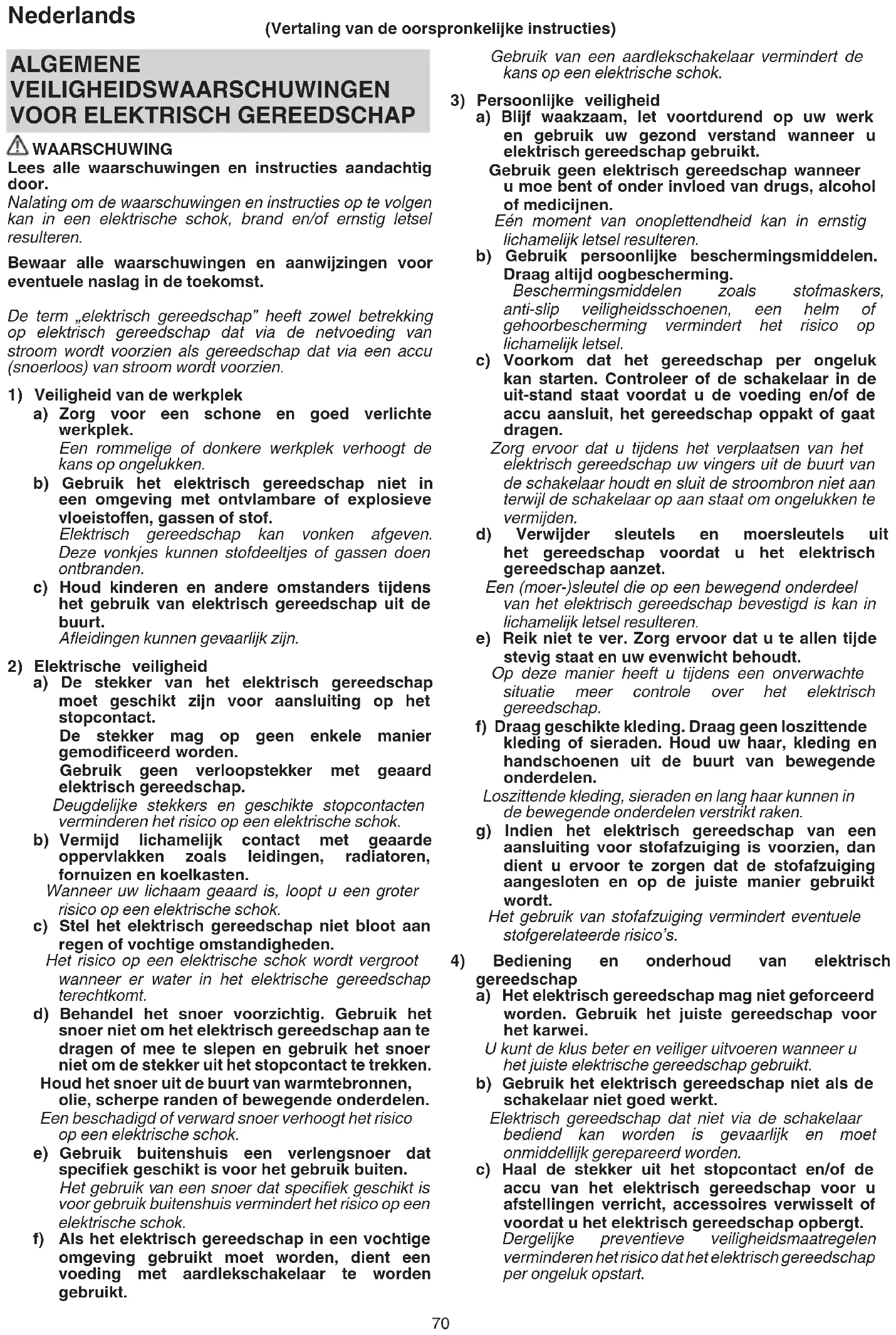 WAARSCHUWING Lees alle waarschuwingen en instructies aandachtig door. Nalating om de waarschuwingen en instructies op te volgen kan in een elektrische schok, brand en/of ernstig letsel resulteren. Bewaar alle waarschuwingen en aanwijzingen voor eventuele naslag in de toekomst. De term „elektrisch gereedschap” heeft zowel betrekking op elektrisch gereedschap dat via de netvoeding van stroom wordt voorzien als gereedschap dat via een accu (snoerloos) van stroom wordt voorzien.