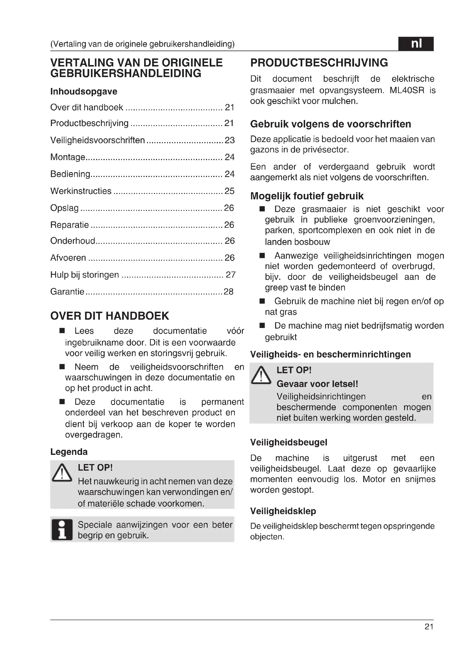 Lees deze documentatie vóór ingebruikname door. Dit is een voorwaarde voor veilig werken en storingsvrij gebruik. Neem de veiligheidsvoorschriften en waarschuwingen in deze documentatie en op het product in acht. Deze documentatie is permanent onderdeel van het beschreven product en dient bij verkoop aan de koper te worden overgedragen. Legenda LET OP! Het nauwkeurig in acht nemen van deze waarschuwingen kan verwondingen en/ of materiële schade voorkomen. Speciale aanwijzingen voor een beter begrip en gebruik. PRODUCTBESCHRIJVING Dit document beschrijft de elektrische grasmaaier met opvangsysteem. ML40SR is ook geschikt voor mulchen. Gebruik volgens de voorschriften Deze applicatie is bedoeld voor het maaien van gazons in de privésector. Een ander of verdergaand gebruik wordt aangemerkt als niet volgens de voorschriften. Mogelijk foutief gebruik Deze grasmaaier is niet geschikt voor gebruik in publieke groenvoorzieningen, parken, sportcomplexen en ook niet in de landen bosbouw Aanwezige veiligheidsinrichtingen mogen niet worden gedemonteerd of overbrugd, bijv. door de veiligheidsbeugel aan de greep vast te binden Gebruik de machine niet bij regen en/of op nat gras De machine mag niet bedrijfsmatig worden gebruikt Veiligheids- en bescherminrichtingen LET OP! Gevaar voor letsel! Veiligheidsinrichtingen en beschermende componenten mogen niet buiten werking worden gesteld. Veiligheidsbeugel De machine is uitgerust met een veiligheidsbeugel. Laat deze op gevaarlijke momenten eenvoudig los. Motor en snijmes worden gestopt. Veiligheidsklep De veiligheidsklep beschermt tegen opspringende objecten. 0000BookML34SR.indb210000BookML34SR.indb21 2017/12/0814:20:222017/12/0814:20:22nl ML 34SR / ML 40SR