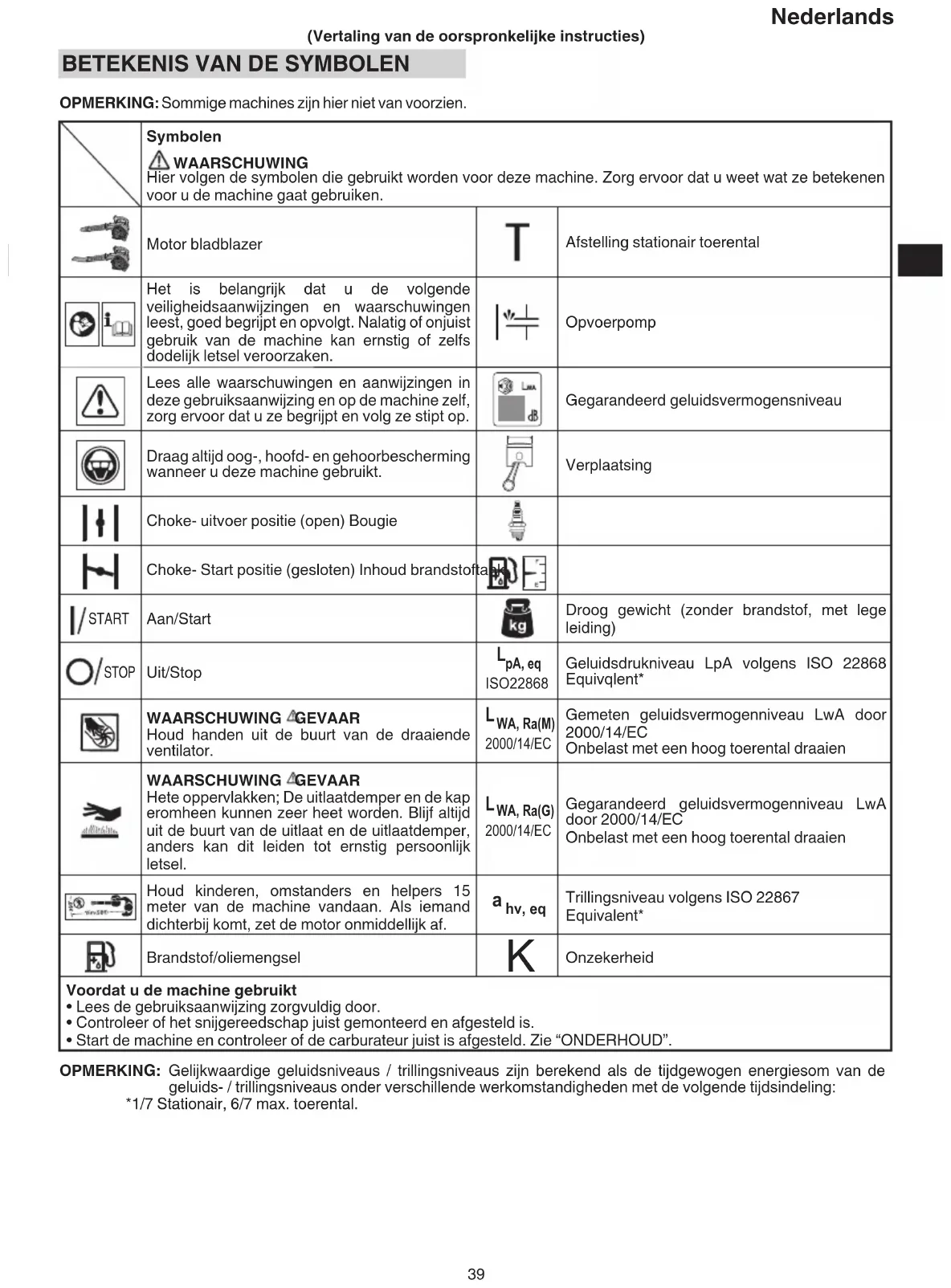 OPMERKING: Sommige machines zijn hier niet van voorzien. Symbolen WAARSCHUWING Hier volgen de symbolen die gebruikt worden voor deze machine. Zorg ervoor dat u weet wat ze betekenen voor u de machine gaat gebruiken. Motor bladblazer Afstelling stationair toerental Het is belangrijk dat u de volgende veiligheidsaanwijzingen en waarschuwingen leest, goed begrijpt en opvolgt. Nalatig of onjuist gebruik van de machine kan ernstig of zelfs dodelijk letsel veroorzaken. Opvoerpomp Lees alle waarschuwingen en aanwijzingen in deze gebruiksaanwijzing en op de machine zelf, zorg ervoor dat u ze begrijpt en volg ze stipt op. Gegarandeerd geluidsvermogensniveau Draag altijd oog-, hoofd- en gehoorbescherming wanneer u deze machine gebruikt. Verplaatsing Choke- uitvoer positie (open) Bougie Choke- Start positie (gesloten) Inhoud brandstoftank START Aan/Start Droog gewicht (zonder brandstof, met lege leiding) STOP Uit/Stop