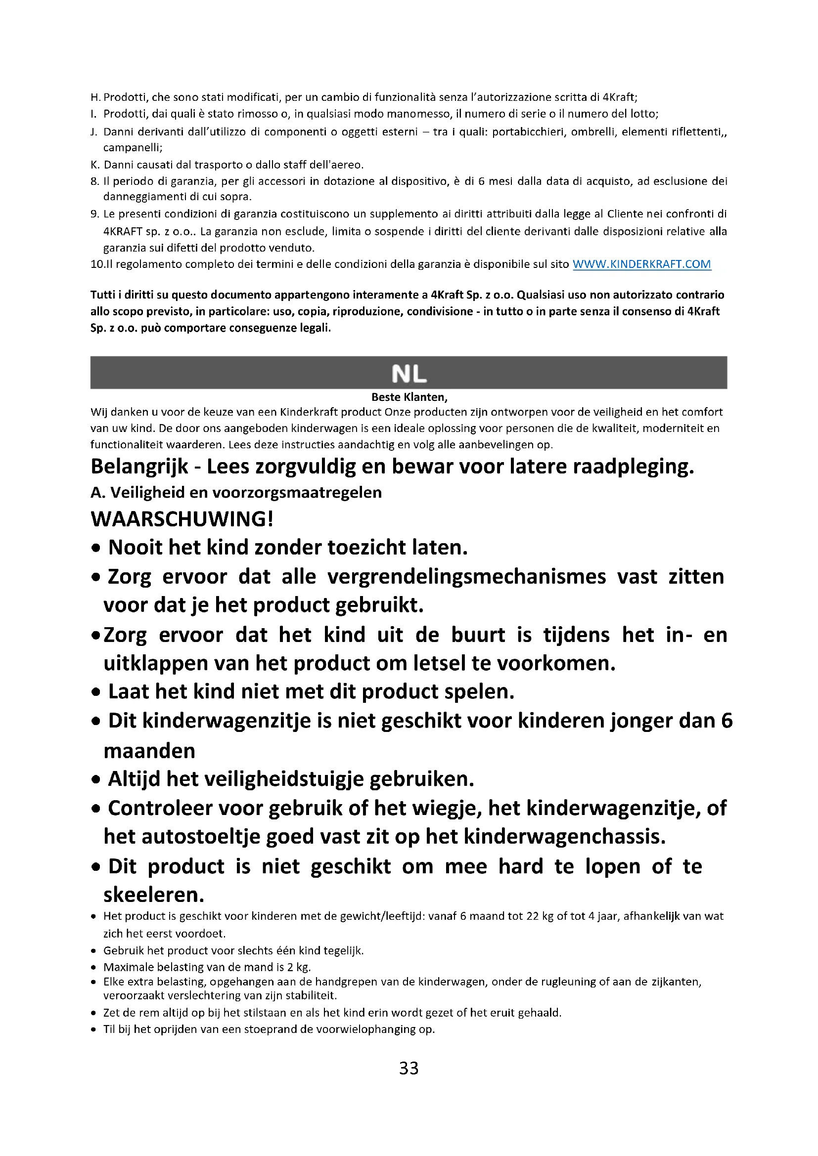 o.o. De garantie sluit de rechten van de Klant uit hoofde van de wettelijke aansprakelijkheid van de verkoper voor gebreken in het verkochte product niet uit, beperkt deze niet en schort deze ook niet op. 10.De volledige inhoud van de Garantievoorwaarden is te vinden op de website WWW.KINDERKRAFT.COM Alle rechten op deze uitgave komen uitsluitend toe aan 4Kraft Sp. z o.o. Elk ongeoorloofd gebruik ervan in strijd met de bestemming ervan, waaronder met name: het gebruiken, kopiëren, reproduceren, ter beschikking stellen - in zijn geheel of gedeeltelijk zonder toestemming van 4Kraft Sp. z o.o. - kan tot rechtsgevolgen leiden. Szanowni Klienci, Dziękujemy za zakup produktu marki Kinderkraft. Nasze produkty zostały zaprojektowane z myślą o bezpieczeństwie oraz komforcie Twojego dziecka. Wózek jest idealnym rozwiązaniem dla tych, którzy cenią sobie jakość, nowoczesność oraz funkcjonalność. Prosimy o zapoznanie się z treścią instrukcji obsługi oraz o stosowanie się do jej zaleceń. WAŻNE! PRZECZYTAJ UWAŻNIE I ZACHOWAJ NA PRZYSZŁOŚĆ JAKO ODNIESIENIE A. Uwagi dotyczące bezpieczeństwa i środków ostrożności OSTRZEŻENIE!