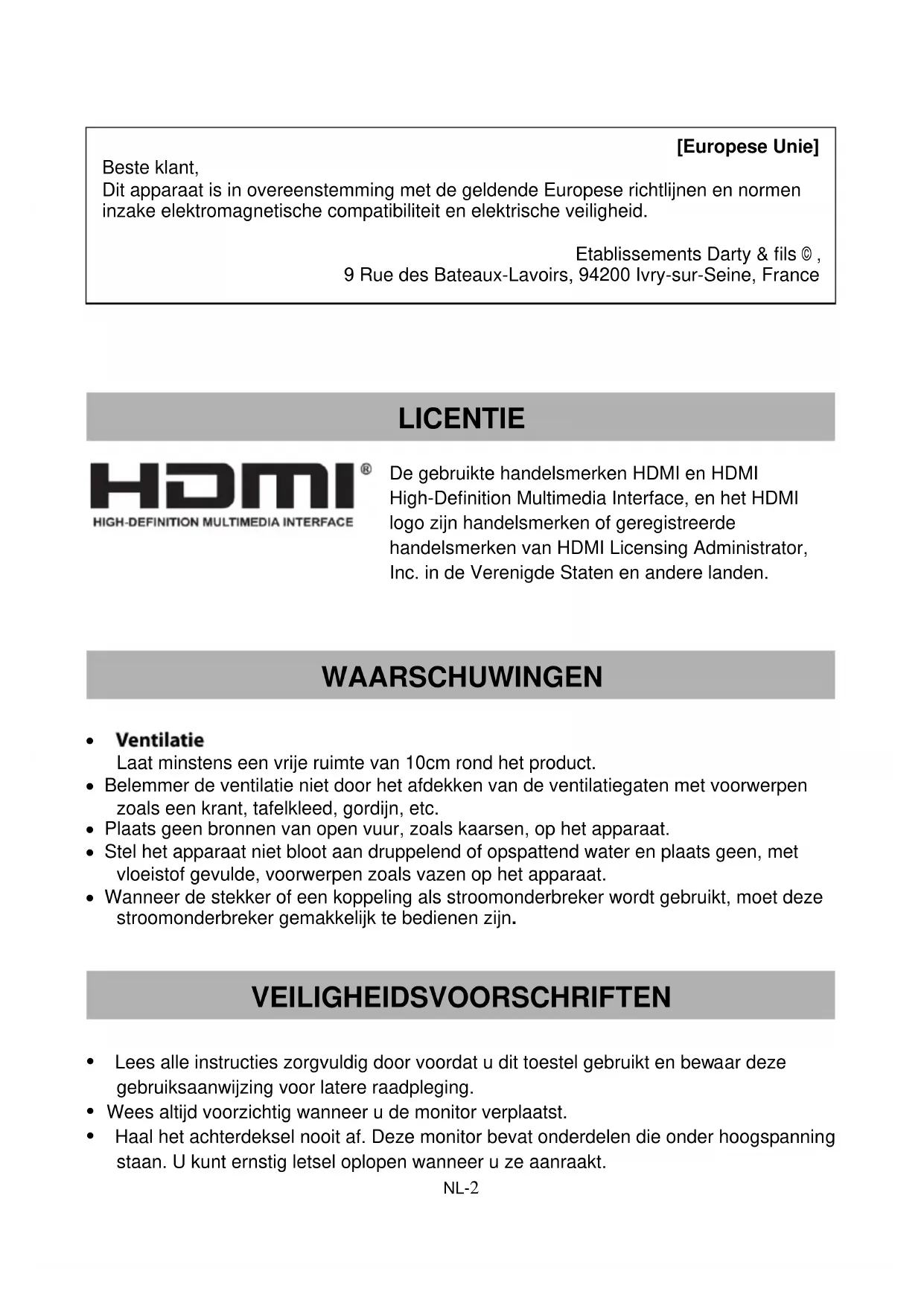 Lees alle instructies zorgvuldig door voordat u dit toestel gebruikt en bewaar deze gebruiksaanwijzing voor latere raadpleging. Wees altijd voorzichtig wanneer u de monitor verplaatst. Haal het achterdeksel nooit af. Deze monitor bevat onderdelen die onder hoogspanning staan. U kunt ernstig letsel oplopen wanneer u ze aanraakt. VEILIGHEIDSVOORSCHRIFTEN LICENTIE WAARSCHUWINGEN [Europese Unie] Beste klant, Dit apparaat is in overeenstemming met de geldende Europese richtlijnen en normen inzake elektromagnetische compatibiliteit en elektrische veiligheid. Etablissements Darty & fils © , 9 Rue des Bateaux-Lavoirs, 94200 Ivry-sur-Seine, FranceNL-3 Gebruik het product niet in de nabijheid van water. Stel het apparaat niet bloot aan regen of vocht om brandgevaar of elektrische schokken te voorkomen. Stel de monitor niet bloot aan direct zonlicht of een andere warmtebron. Richt de monitor weg van direct zonlicht om verblinding te beperken. Raak de monitor niet aan. Huidoliën zijn moeilijk te verwijderen. Wrijf niet over het scherm of oefen er geen druk op uit om permanente schade aan het scherm te vermijden. Plaats dit product niet op een onstabiele wagen, stander of tafel. Belemmer de ventilatieopeningen niet. Installeer het apparaat niet in de buurt van warmtebronnen zoals radiatoren, warmteafvoeren, kachels of andere warmteproducerende apparaten. Installeer de monitor in een goed geventileerde ruimte. Plaats niets op de monitor om de afgifte van warmte niet te belemmeren. Plaats geen zware voorwerpen op de monitor, videokabel of het snoer. Als rook, een ongewoon geluid of een vreemde geur wordt waargenomen, schakel de monitor onmiddellijk uit. Bescherm het snoer tegen knikken, vooral bij de stekker, en zorg dat er niet over het snoer gelopen kan worden. Zorg dat het gebruikte stopcontact zich in de buurt van het apparaat bevindt zodat het eenvoudig bereikbaar is. Gebruik alleen hulpstukken/accessoires die door de fabrikant worden aanbevolen. Haal de stekker uit het stopcontact als u het apparaat langere tijd niet denkt te gebruiken. Laat alle reparaties door een vakbekwame reparateur uitvoeren.