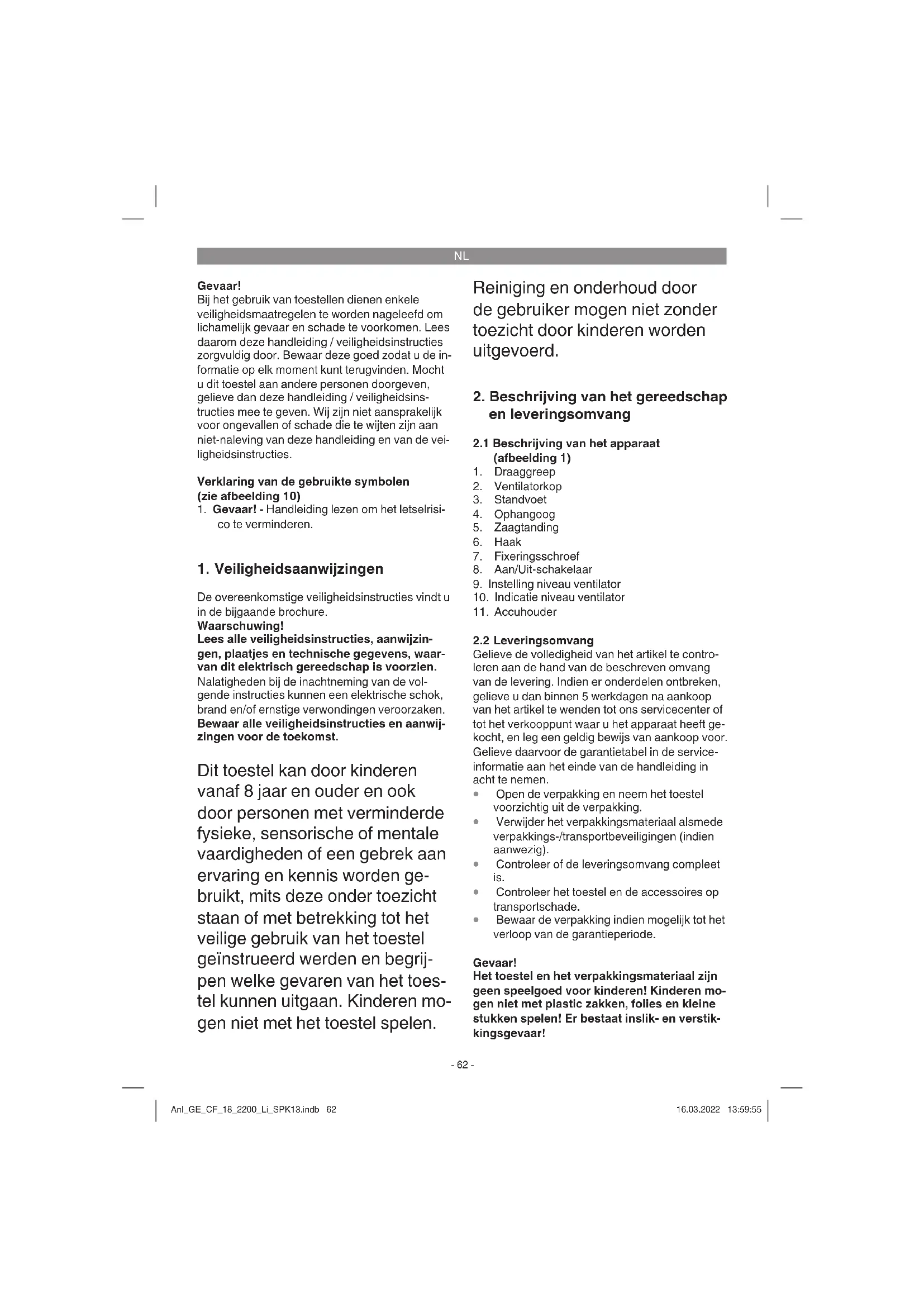 Bewaar de verpakking indien mogelijk tot het verloop van de garantieperiode. Gevaar! Het toestel en het verpakkingsmateriaal zijn geen speelgoed voor kinderen! Kinderen mo- gen niet met plastic zakken, folies en kleine stukken spelen! Er bestaat inslik- en verstik- kingsgevaar! Anl_GE_CF_18_2200_Li_SPK13.indb 62Anl_GE_CF_18_2200_Li_SPK13.indb 62 16.03.2022 13:59:5516.03.2022 13:59:55NL