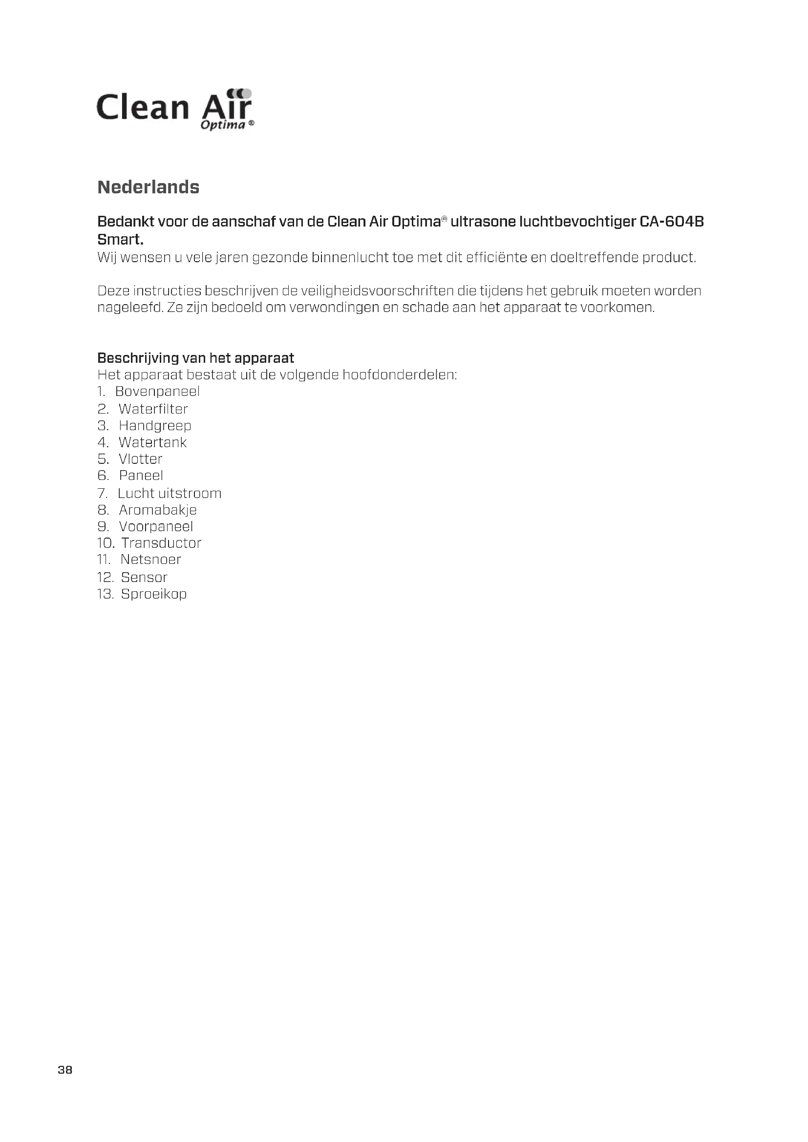 CA-604B Smart / Display38 Nederlands Bedankt voor de aanschaf van de Clean Air Optima® ultrasone luchtbevochtiger CA-604B Smart. Wij wensen u vele jaren gezonde binnenlucht toe met dit eciënte en doeltreende product. Deze instructies beschrijven de veiligheidsvoorschriften die tijdens het gebruik moeten worden nageleefd. Ze zijn bedoeld om verwondingen en schade aan het apparaat te voorkomen. Beschrijving van het apparaat Het apparaat bestaat uit de volgende hoofdonderdelen: