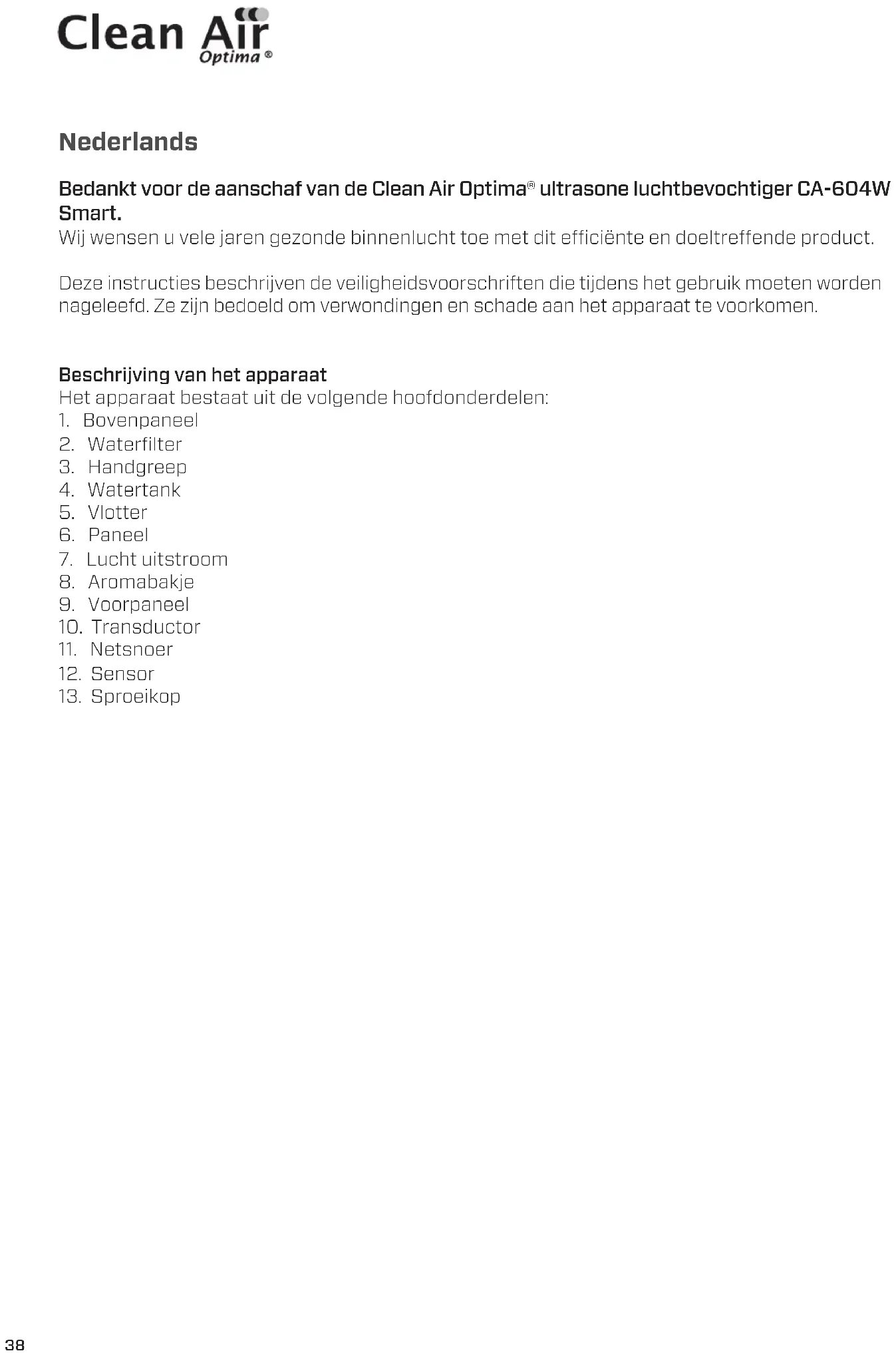 CA-604W Smart / Display38 Nederlands Bedankt voor de aanschaf van de Clean Air Optima® ultrasone luchtbevochtiger CA-604W Smart. Wij wensen u vele jaren gezonde binnenlucht toe met dit eciënte en doeltreende product. Deze instructies beschrijven de veiligheidsvoorschriften die tijdens het gebruik moeten worden nageleefd. Ze zijn bedoeld om verwondingen en schade aan het apparaat te voorkomen. Beschrijving van het apparaat Het apparaat bestaat uit de volgende hoofdonderdelen: