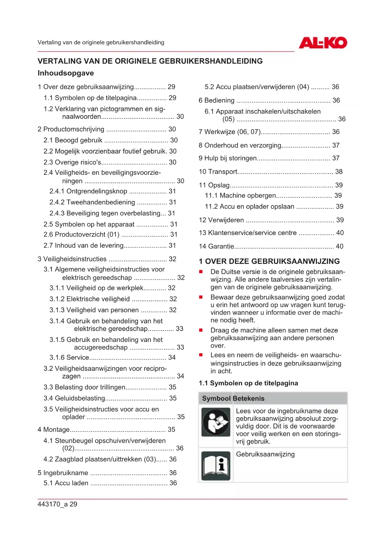 Een verzamelpunt van de fabrikant (indien hij geen lid is van het gemeenschappelijke recy- cling systeem) Deze voorschriften zijn alleen voor toepassing op accu’s en batterijen die in landen van de Europe- se Unie verkocht werden en die beantwoorden aan de Europese richtlijn 2006/66/EU. In landen buiten de Europese Unie kunnen afwijkende be- palingen voor de recycling van accu’s en batterij- en gelden. 13 KLANTENSERVICE/SERVICE CENTRE Voor vragen over garantie, reparatie of reserve- onderdelen kunt u contact opnemen met het dichtstbijzijnde AL-KOservice centre. Deze vindt u op internet op het volgende adres: www.al-ko.com/service-contacts 14 GARANTIE Eventueel binnen de wettelijke termijn voor aansprakelijkheid optredende materiaal- of fabricagefou- ten van het apparaat worden naar eigen oordeel door ons verholpen, hetzij door reparatie of door le- vering van een vervangend apparaat. De geldende termijn voor aansprakelijkheid hangt in elk geval af van de wetgeving in het land waarin het apparaat werd aangeschaft. Onze garantie geldt alleen bij: