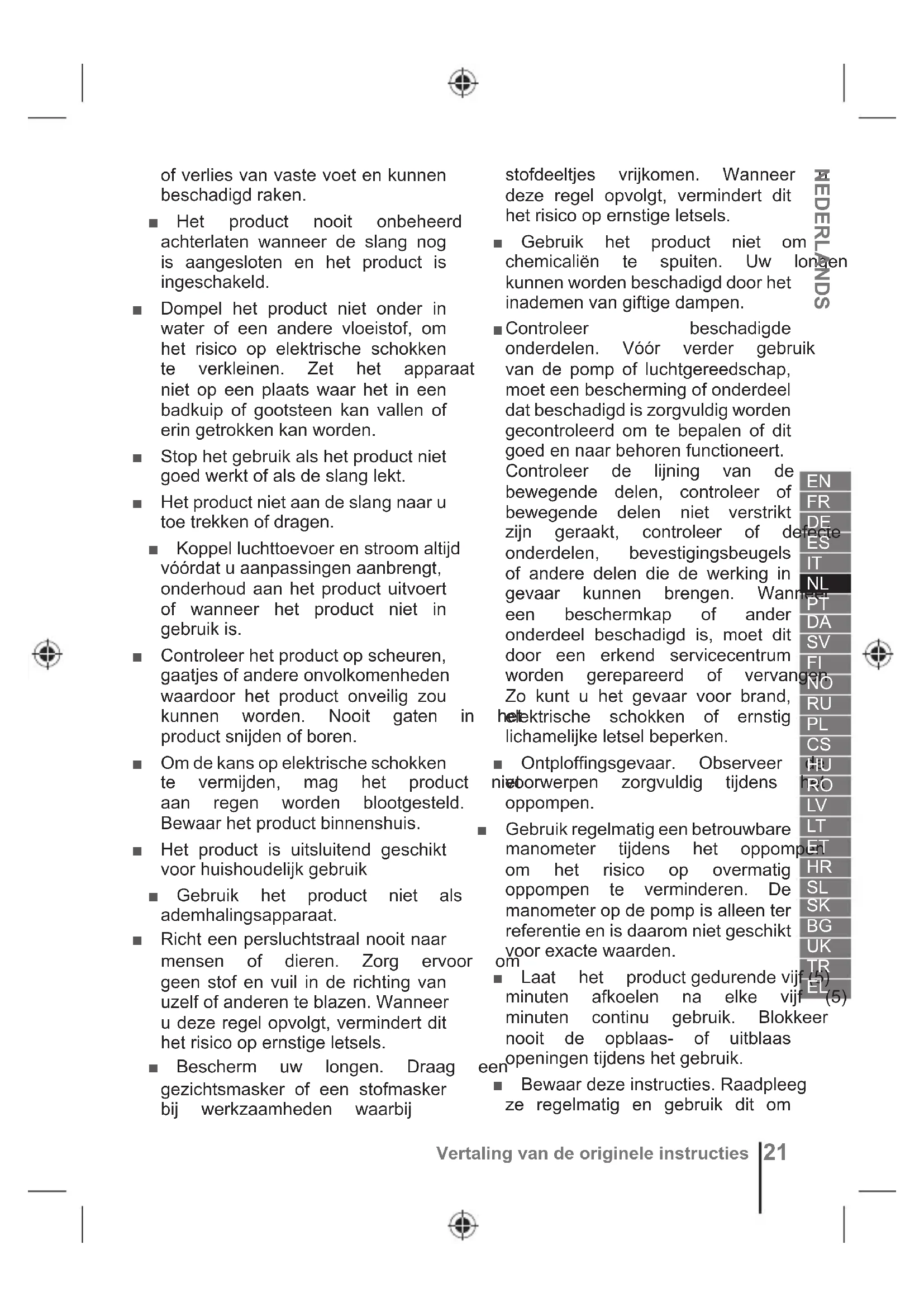 Vertaling van de originele instructiesof verlies van vaste voet en kunnen EHVFKDGLJGUDNHQ Ŷ Het product nooit onbeheerd achterlaten wanneer de slang nog is aangesloten en het product is LQJHVFKDNHOG Ŷ Dompel het product niet onder in water of een andere vloeistof, om het risico op elektrische schokken