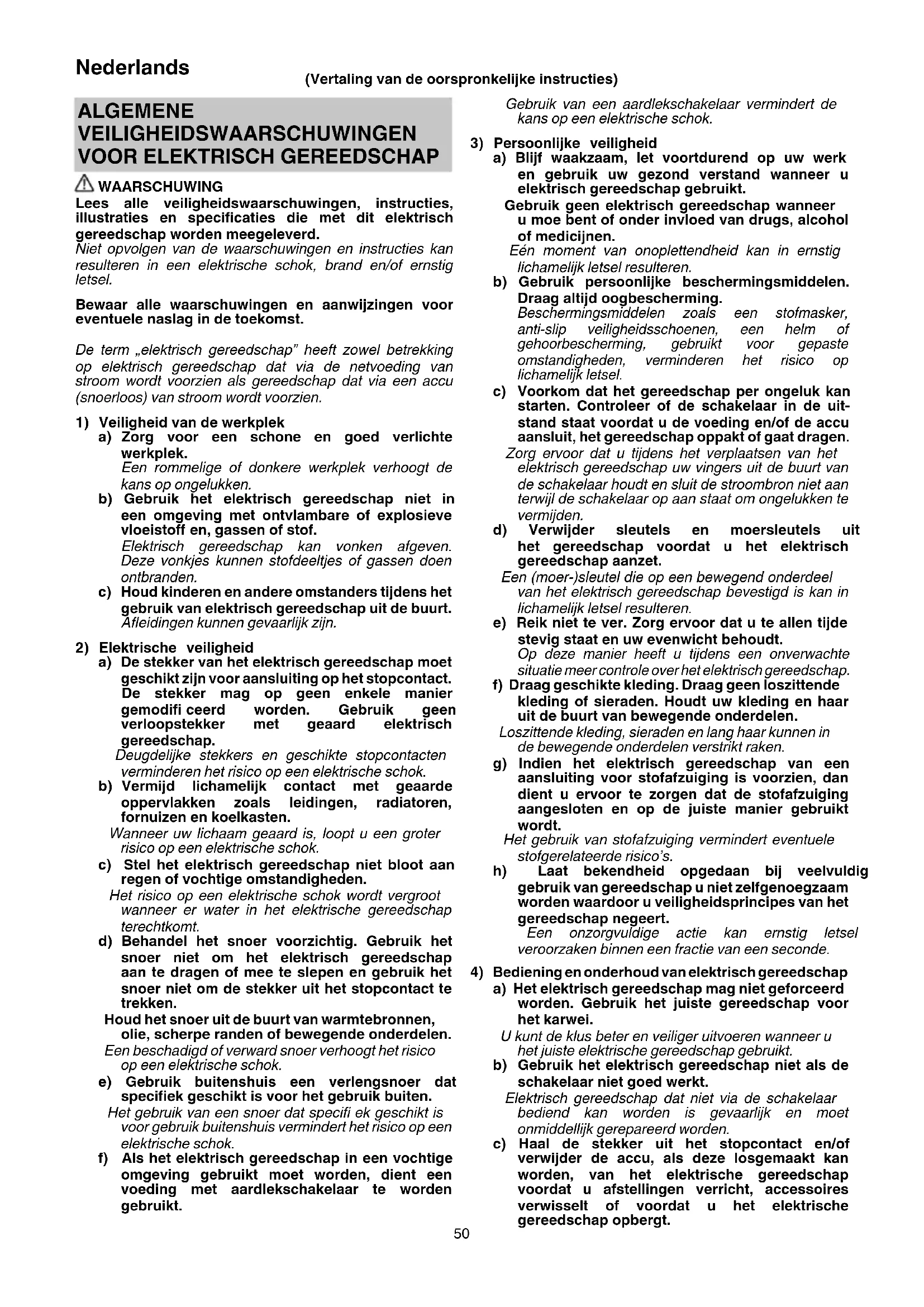 WAARSCHUWING Lees alle veiligheidswaarschuwingen, instructies, illustraties en specifi caties die met dit elektrisch gereedschap worden meegeleverd. Niet opvolgen van de waarschuwingen en instructies kan resulteren in een elektrische schok, brand en/of ernstig letsel. Bewaar alle waarschuwingen en aanwijzingen voor eventuele naslag in de toekomst. De term „elektrisch gereedschap” heeft zowel betrekking op elektrisch gereedschap dat via de netvoeding van stroom wordt voorzien als gereedschap dat via een accu (snoerloos) van stroom wordt voorzien.
