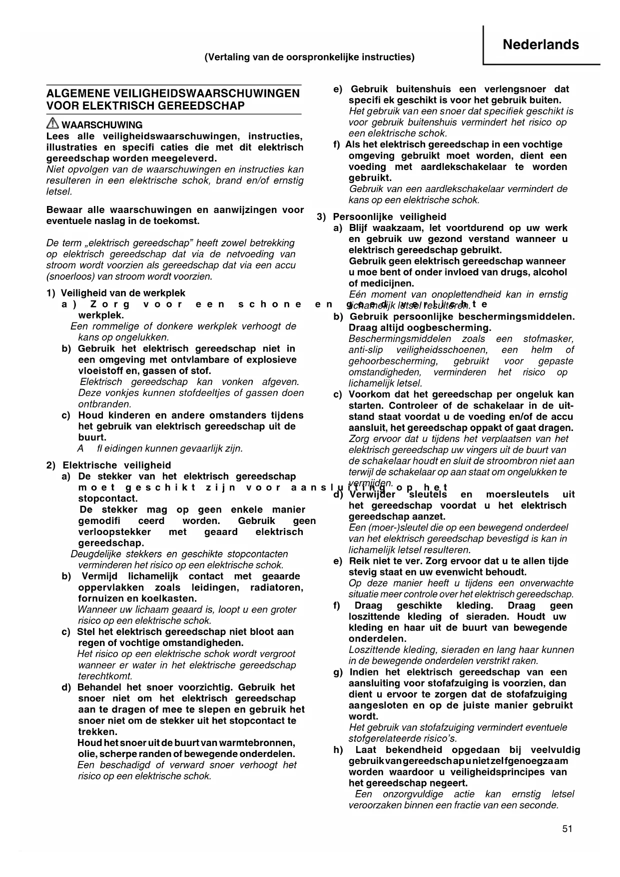 WAARSCHUWING Lees alle veiligheidswaarschuwingen, instructies, illustraties en specifi caties die met dit elektrisch gereedschap worden meegeleverd. Niet opvolgen van de waarschuwingen en instructies kan resulteren in een elektrische schok, brand en/of ernstig letsel. Bewaar alle waarschuwingen en aanwijzingen voor eventuele naslag in de toekomst. De term „elektrisch gereedschap” heeft zowel betrekking op elektrisch gereedschap dat via de netvoeding van stroom wordt voorzien als gereedschap dat via een accu (snoerloos) van stroom wordt voorzien.