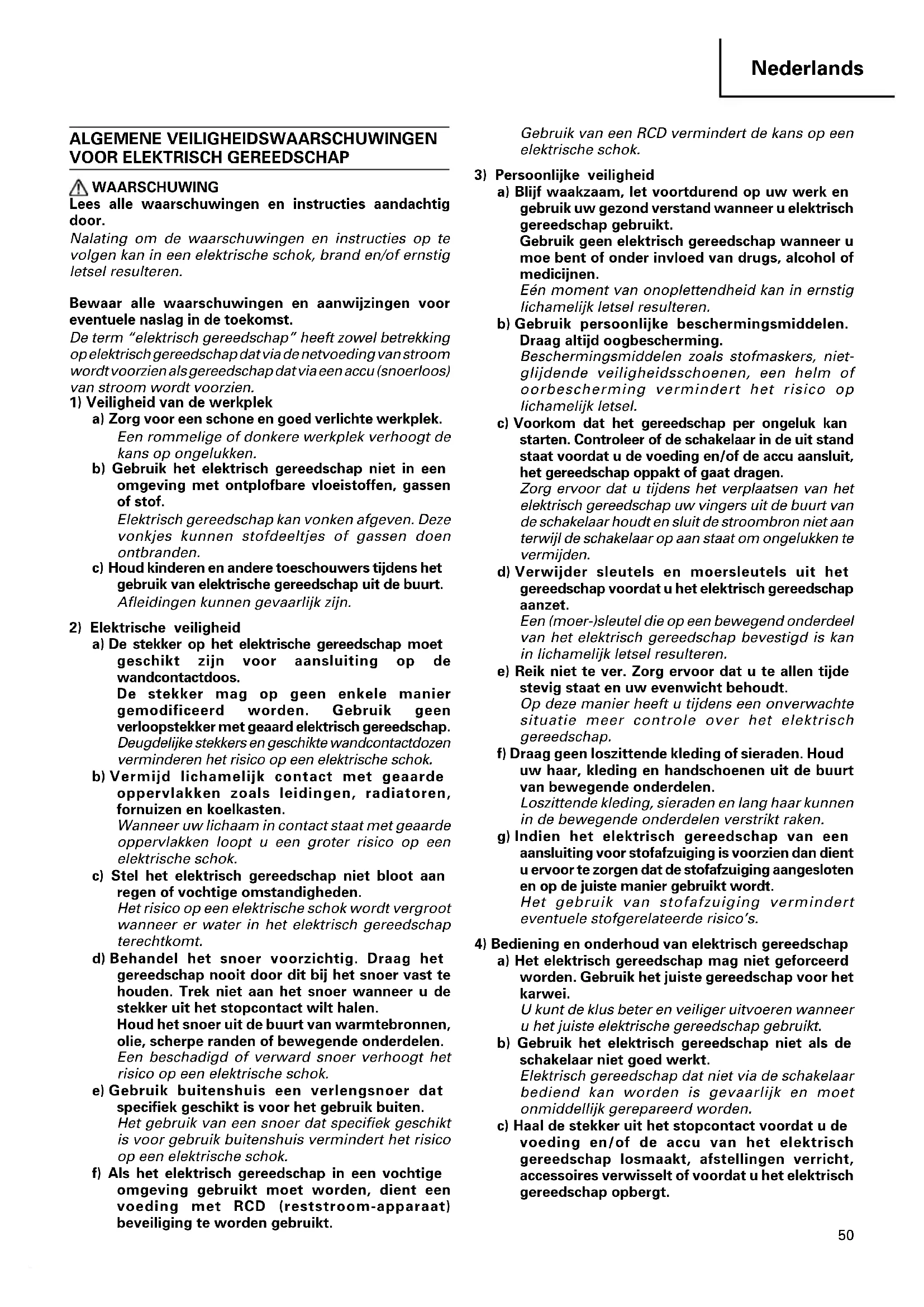 a) Het elektrisch gereedschap mag niet geforceerd worden. Gebruik het juiste gereedschap voor het karwei. U kunt de klus beter en veiliger uitvoeren wanneer u het juiste elektrische gereedschap gebruikt. b) Gebruik het elektrisch gereedschap niet als de schakelaar niet goed werkt. Elektrisch gereedschap dat niet via de schakelaar bediend kan worden is gevaarlijk en moet onmiddellijk gerepareerd worden. c) Haal de stekker uit het stopcontact voordat u de voeding en/of de accu van het elektrisch gereedschap losmaakt, afstellingen verricht, accessoires verwisselt of voordat u het elektrisch gereedschap opbergt. 05Ned_WH12DAF2_WE 5/14/08, 18:1450Nederlands