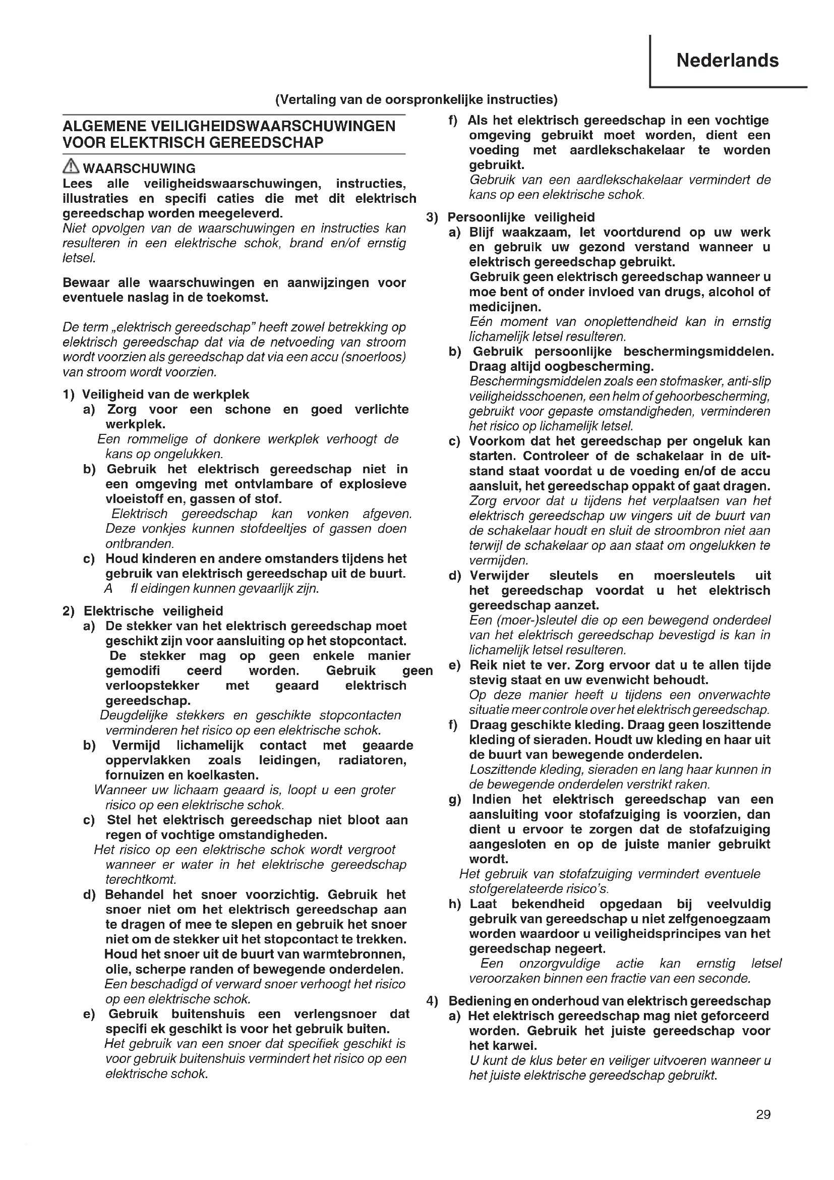 WAARSCHUWING Lees alle veiligheidswaarschuwingen, instructies, illustraties en specifi caties die met dit elektrisch gereedschap worden meegeleverd. Niet opvolgen van de waarschuwingen en instructies kan resulteren in een elektrische schok, brand en/of ernstig letsel. Bewaar alle waarschuwingen en aanwijzingen voor eventuele naslag in de toekomst. De term „elektrisch gereedschap” heeft zowel betrekking op elektrisch gereedschap dat via de netvoeding van stroom wordt voorzien als gereedschap dat via een accu (snoerloos) van stroom wordt voorzien.