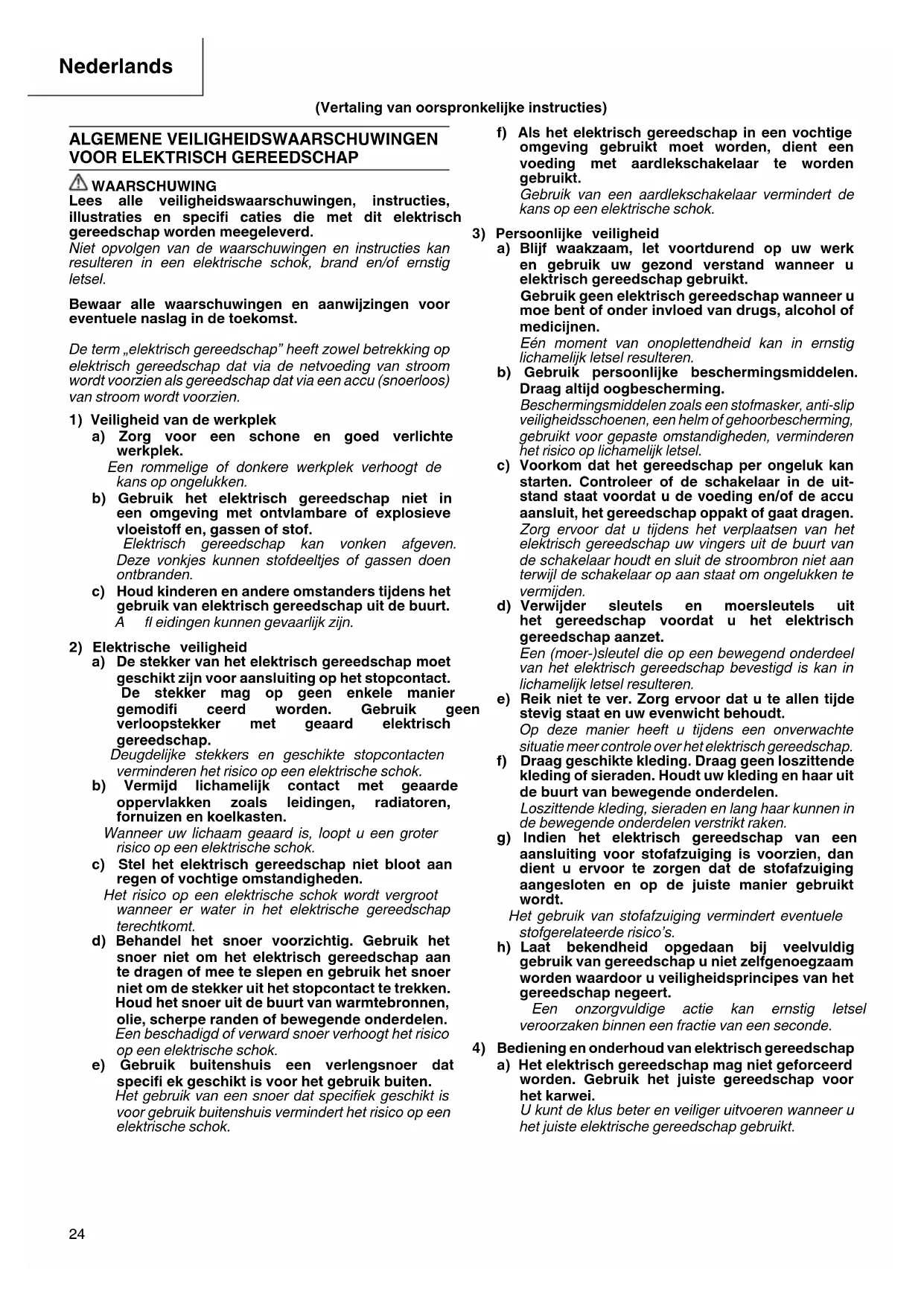 a) Blijf waakzaam, let voortdurend op uw werk en gebruik uw gezond verstand wanneer u elektrisch gereedschap gebruikt. Gebruik geen elektrisch gereedschap wanneer u moe bent of onder invloed van drugs, alcohol of medicijnen. Eén moment van onoplettendheid kan in ernstig lichamelijk letsel resulteren. b) Gebruik persoonlijke beschermingsmiddelen. Draag altijd oogbescherming. Beschermingsmiddelen zoals een stofmasker, anti-slip veiligheidsschoenen, een helm of gehoorbescherming, gebruikt voor gepaste omstandigheden, verminderen het risico op lichamelijk letsel.