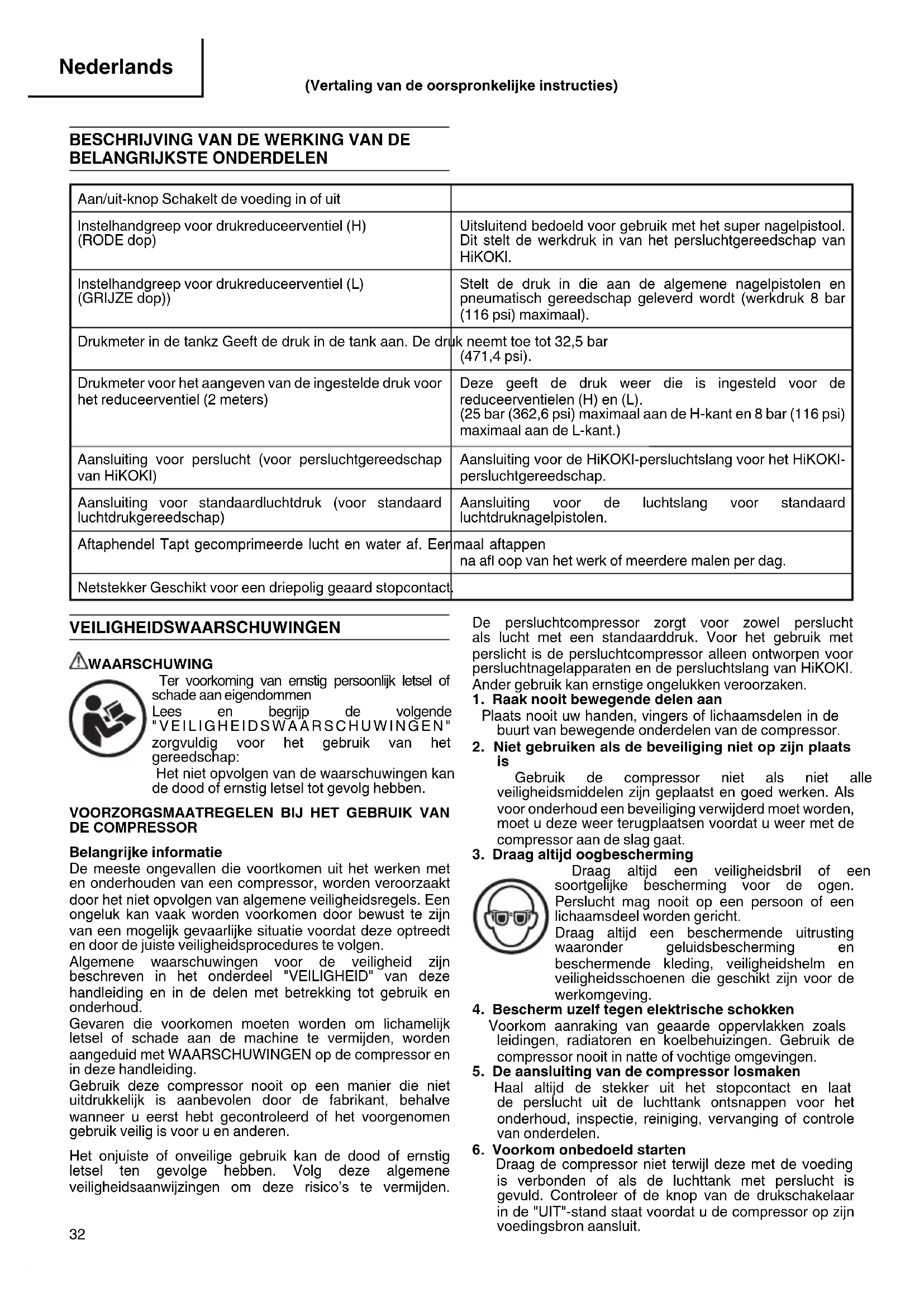 BELANGRIJKSTE ONDERDELEN Aan/uit-knop Schakelt de voeding in of uit Instelhandgreep voor drukreduceerventiel (H) (RODE dop) Uitsluitend bedoeld voor gebruik met het super nagelpistool. Dit stelt de werkdruk in van het persluchtgereedschap van HiKOKI. Instelhandgreep voor drukreduceerventiel (L) (GRIJZE dop)) Stelt de druk in die aan de algemene nagelpistolen en pneumatisch gereedschap geleverd wordt (werkdruk 8 bar (116 psi) maximaal). Drukmeter in de tankz Geeft de druk in de tank aan. De druk neemt toe tot 32,5 bar (471,4 psi). Drukmeter voor het aangeven van de ingestelde druk voor het reduceerventiel (2 meters) Deze geeft de druk weer die is ingesteld voor de reduceerventielen (H) en (L). (25 bar (362,6 psi) maximaal aan de H-kant en 8 bar (116 psi) maximaal aan de L-kant.) Aansluiting voor perslucht (voor persluchtgereedschap van HiKOKI) Aansluiting voor de HiKOKI-persluchtslang voor het HiKOKI- persluchtgereedschap. Aansluiting voor standaardluchtdruk (voor standaard luchtdrukgereedschap) Aansluiting voor de luchtslang voor standaard luchtdruknagelpistolen. Aftaphendel Tapt gecomprimeerde lucht en water af. Eenmaal aftappen na afl oop van het werk of meerdere malen per dag. Netstekker Geschikt voor een driepolig geaard stopcontact. VEILIGHEIDSWAARSCHUWINGEN WAARSCHUWING Ter voorkoming van ernstig persoonlijk letsel of schade aan eigendommen Lees en begrijp de volgende "VEILIGHEIDSWAARSCHUWINGEN" zorgvuldig voor het gebruik van het gereedschap: Het niet opvolgen van de waarschuwingen kan de dood of ernstig letsel tot gevolg hebben.