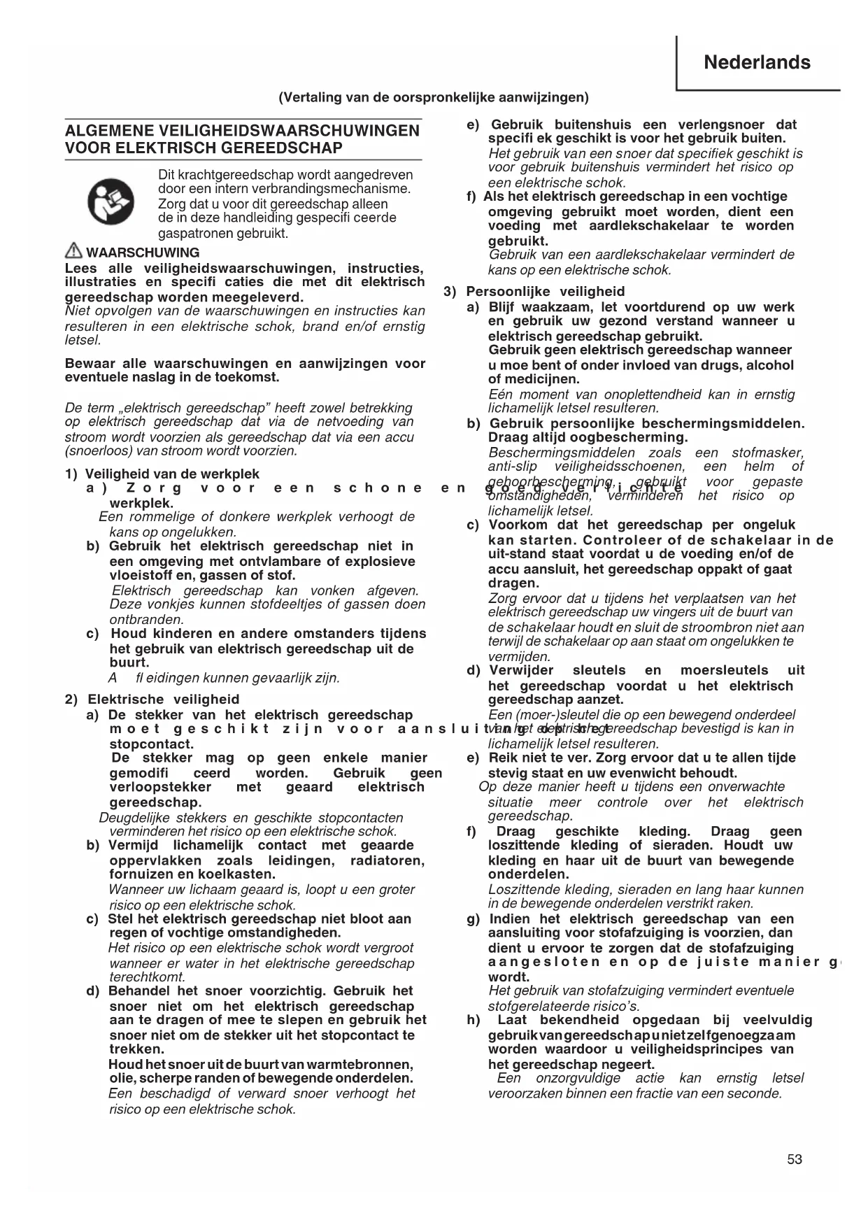 Dit krachtgereedschap wordt aangedreven door een intern verbrandingsmechanisme. Zorg dat u voor dit gereedschap alleen de in deze handleiding gespecifi ceerde gaspatronen gebruikt. WAARSCHUWING Lees alle veiligheidswaarschuwingen, instructies, illustraties en specifi caties die met dit elektrisch gereedschap worden meegeleverd. Niet opvolgen van de waarschuwingen en instructies kan resulteren in een elektrische schok, brand en/of ernstig letsel. Bewaar alle waarschuwingen en aanwijzingen voor eventuele naslag in de toekomst. De term „elektrisch gereedschap” heeft zowel betrekking op elektrisch gereedschap dat via de netvoeding van stroom wordt voorzien als gereedschap dat via een accu (snoerloos) van stroom wordt voorzien.