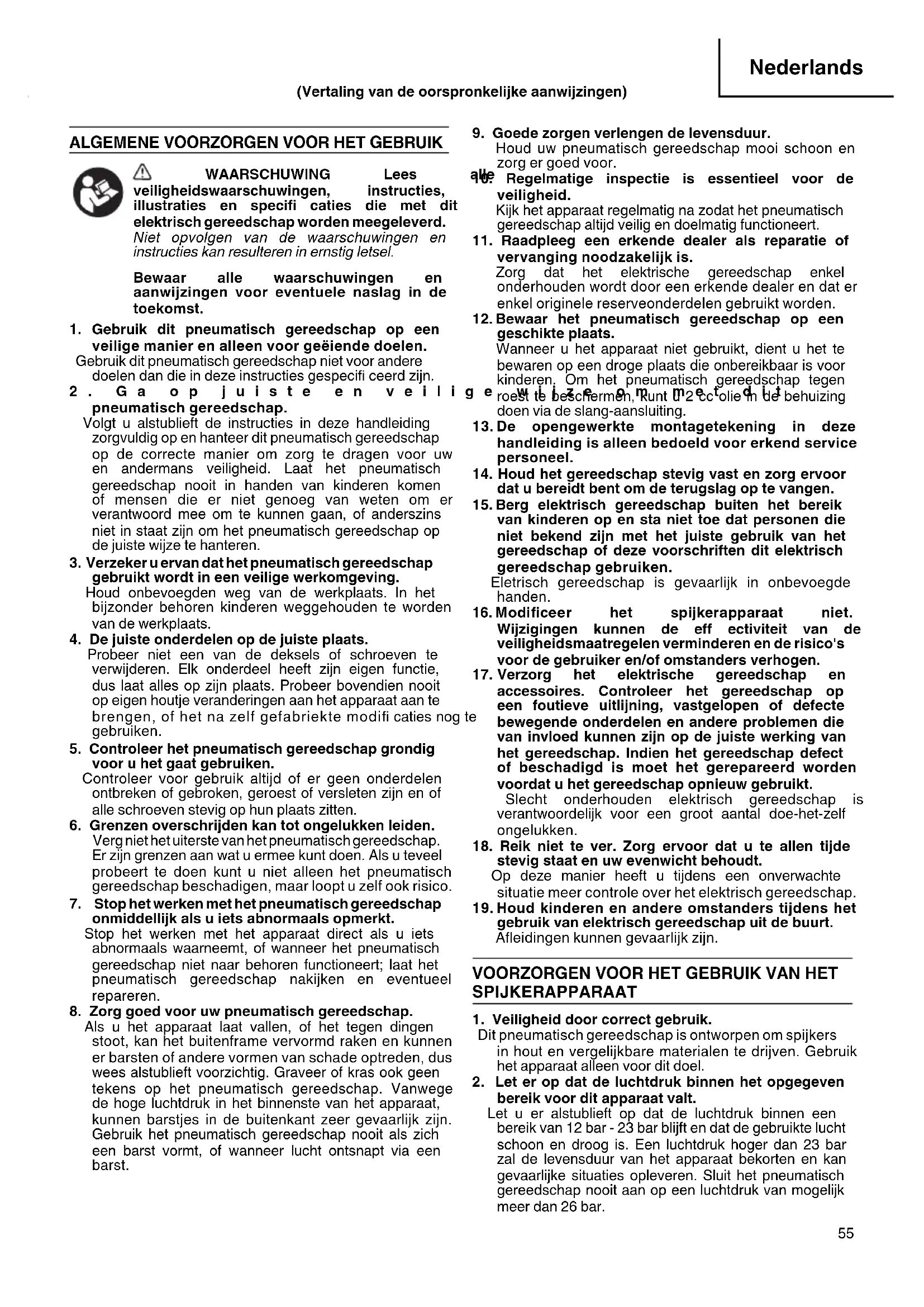 pneumatisch gereedschap. Volgt u alstublieft de instructies in deze handleiding zorgvuldig op en hanteer dit pneumatisch gereedschap op de correcte manier om zorg te dragen voor uw en andermans veiligheid. Laat het pneumatisch gereedschap nooit in handen van kinderen komen of mensen die er niet genoeg van weten om er verantwoord mee om te kunnen gaan, of anderszins niet in staat zijn om het pneumatisch gereedschap op de juiste wijze te hanteren.