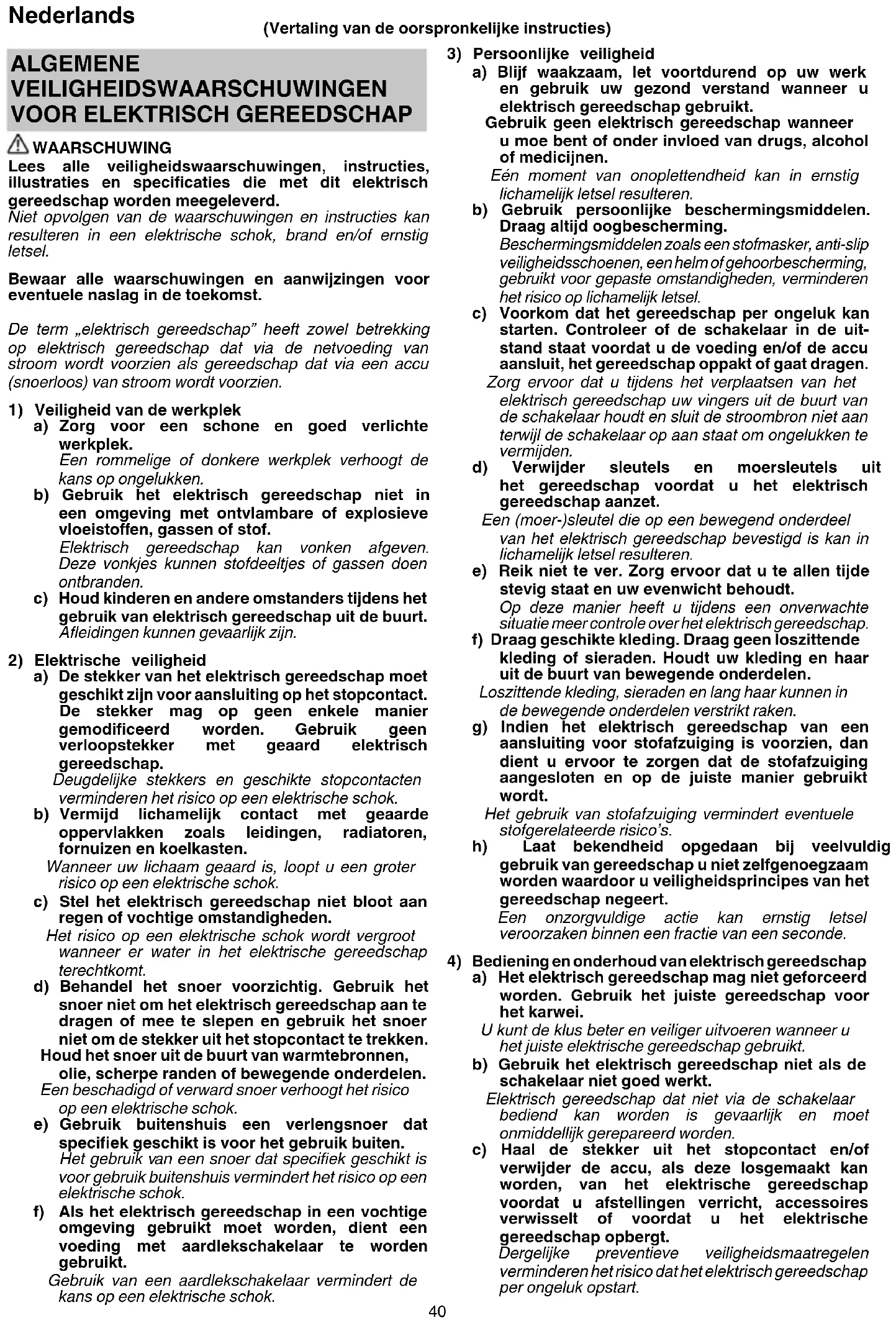 WAARSCHUWING Lees alle veiligheidswaarschuwingen, instructies, illustraties en specifi caties die met dit elektrisch gereedschap worden meegeleverd. Niet opvolgen van de waarschuwingen en instructies kan resulteren in een elektrische schok, brand en/of ernstig letsel. Bewaar alle waarschuwingen en aanwijzingen voor eventuele naslag in de toekomst. De term „elektrisch gereedschap” heeft zowel betrekking op elektrisch gereedschap dat via de netvoeding van stroom wordt voorzien als gereedschap dat via een accu (snoerloos) van stroom wordt voorzien.