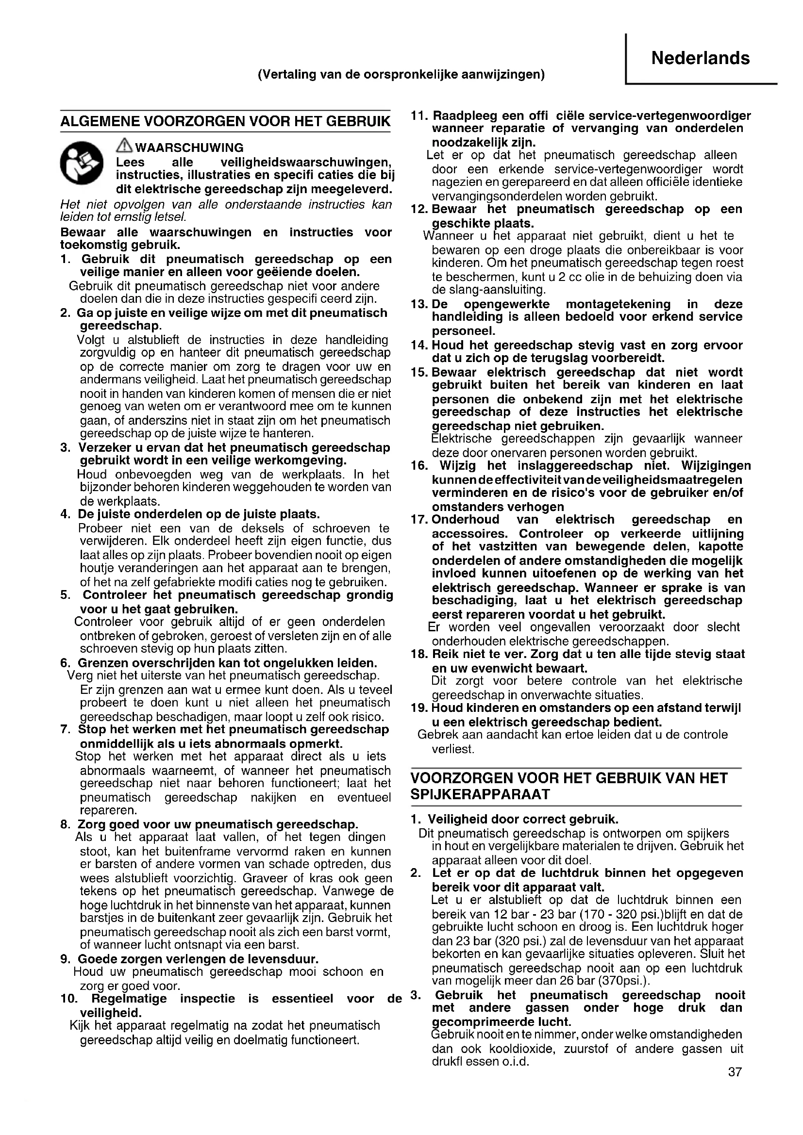 gereedschap. Volgt u alstublieft de instructies in deze handleiding zorgvuldig op en hanteer dit pneumatisch gereedschap op de correcte manier om zorg te dragen voor uw en andermans veiligheid. Laat het pneumatisch gereedschap nooit in handen van kinderen komen of mensen die er niet genoeg van weten om er verantwoord mee om te kunnen gaan, of anderszins niet in staat zijn om het pneumatisch gereedschap op de juiste wijze te hanteren.