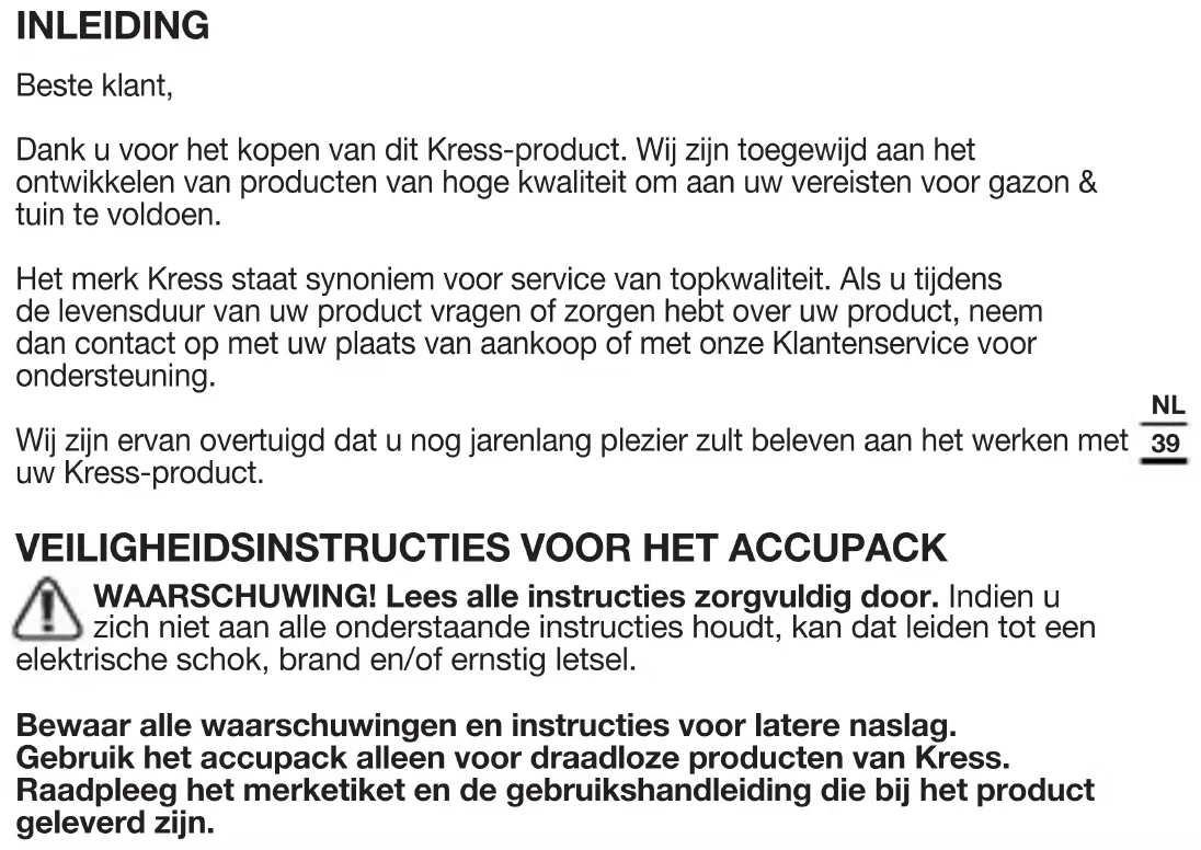 WAARSCHUWING! Lees alle instructies zorgvuldig door. Indien u zich niet aan alle onderstaande instructies houdt, kan dat leiden tot een elektrische schok, brand en/of ernstig letsel. Bewaar alle waarschuwingen en instructies voor latere naslag. Gebruik het accupack alleen voor draadloze producten van Kress. Raadpleeg het merketiket en de gebruikshandleiding die bij het product geleverd zijn.40