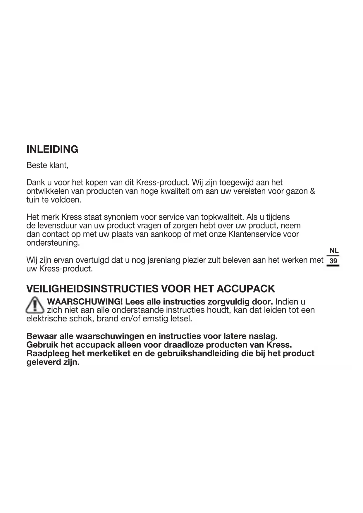 WAARSCHUWING! Lees alle instructies zorgvuldig door. Indien u zich niet aan alle onderstaande instructies houdt, kan dat leiden tot een elektrische schok, brand en/of ernstig letsel. Bewaar alle waarschuwingen en instructies voor latere naslag. Gebruik het accupack alleen voor draadloze producten van Kress. Raadpleeg het merketiket en de gebruikshandleiding die bij het product geleverd zijn.40