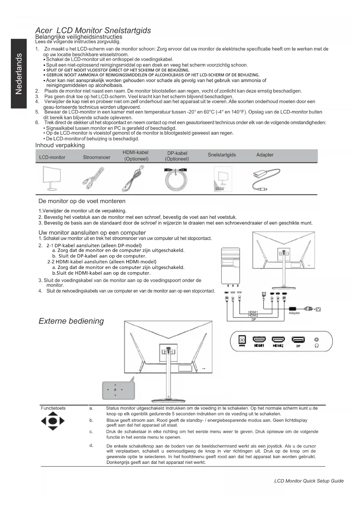 9RRUVFKULIWHQHQYHLOLJKHLGVULFKWOLMQHQ FCC-verklaringen Dit apparaat werd getest en voldoet aan de beperkingen voor een digitaal apparaat van Klasse B, in overeenstemming met Deel 15 van de FCC-voorschriften. Deze beperkingen zijn ontwikkeld om een redelijke beveiliging te bieden tegen schadelijke storingen in een residentiële installatie. Deze apparatuur genereert, gebruikt en straalt radiofrequentie-energie uit die, indien niet geïnstalleerd en gebruikt in overeenstemming met de instructies, schadelijke storingen kan veroorzaken aan radiocommunicaties.Er is echter geen garantie dat er geen storing zal optreden in een particuliere installatie. Als dit apparaat toch schadelijke storingen veroorzaakt aan radio- of televisieontvangst, wat kan vastgesteld worden door het apparaat in en uit te schakelen, moet de gebruiker deze storing proberen te corrigeren door een of meer van de volgende maatregelen te nemen:• Wijzig de richting van de ontvangstantenne of verplaats de antenne.• Vergroot de afstand tussen de apparatuur en de ontvanger.• Sluit het apparaat aan op een stopcontact op een ander circuit dan dat waarop de ontvanger is aangesloten.• Raadpleeg de leverancier of een ervaren radio/tv-technicus voor hulp. CE-conformiteitsverklaring Hierbij verklaart Acer Inc. dat deze LCD-monitor in overeenstemming is met de van belang zijnde eisen en andere essentiële voorzieningen van EMC richtlijn 2014/30/EU, laagspanningsrichtlijn 2014/35/EU, RoHS-richtlijn 2011/65/EU en richtlijn 2009/125/EC betreffende de totstandbrenging van een kader voor het vaststellen van eisen inzake ecologisch ontwerp voor energiegerelateerde producten. Opmerking: Afgeschermde kabels Alle aansluitingen op andere computerapparaten moeten gebeuren met afgeschermde kabels zodat de EMC- voorschriften steeds worden nageleefd. Opmerking: Randapparaten Alleen randapparaten (invoer-/uitvoerapparaten, terminals, printers, enz.) die het certificaat dragen voor naleving van de beperkingen voor Klasse B-apparaten, mogen op dit apparaat worden aangesloten. Het gebruik met niet-gecertificeerde randapparatuur kan mogelijk storingen in radio- en tv-ontvangst veroorzaken. Let op Wijzigingen of modificaties die niet nadrukkelijk door de fabrikant zijn goedgekeurd, kunnen de bevoegdheid van de gebruiker om deze monitor te bedienen, die door de Federale communicatiecommissie is toegekend, ongeldig verklaren. Gebruiksvoorwaarden Dit apparaat voldoet aan Deel 15 van de FCC-voorschriften. Het gebruik is onderhevig aan de volgende twee voorwaarden: (1) Dit apparaat mag geen schadelijke storingen veroorzaken, en (2) dit apparaat moet elke ontvangen storing aanvaarden, met inbegrip van storingen die een ongewenste werking kunnen veroorzaken. Opmerking: Canadese gebruikers This Class B digital apparatus complies with Canadian ICES-003. Remarque à l'intention des utilisateurs canadiens Cet appareil numérique de la classe B est conforme a la norme NMB-003 du Canada. Verwijderen van afgedankte apparatuur door gebruikers in particuliere huishoudens in de Europese Unie Dit symbool op het product of op de verpakking duidt aan dat u het product niet mag wegwerpen met uw gewoon huishoudelijk afval. In plaats daarvan bent u ervoor verantwoordelijk uw niet meer bruikbare apparatuur af te voeren naar een daartoe aangewezen inzamelpunt voor recycling van afgedankte elektrische en elektronische apparatuur. Afzonderlijke inzameling en recycling van als afval afgevoerde apparatuur draagt bij aan het behoud van natuurlijke hulpbronnen en waarborgt dat de apparatuur wordt verwerkt op een manier die de volksgezondheid en het milieu beschermt. Voor meer informatie over de plaats waar apparatuur voor recycling wordt ingezameld, neemt u contact op met de plaatselijke autoriteiten, het plaatselijke afvalverwerkingsbedrijf of de winkel waar u het product hebt gekocht. Om schade te voorkomen aan de monitor, til niet de monitor door de base. Acer monitor is beoogde doeleinden voor video- en visuele weergave van informatie verkregen uit de elektronische apparaten. FreeSync (alleen HDMI/DP): Hiermee kan een ondersteunde grafisch FreeSync-bron de vernieuwings frequentie van het display dynamisch aanpassen op basis van de standaard inhoudsframesnelheden voor energiezuinige, nagenoeg schokvrije update van display met lage latentie.Nederlands SPECIFICATIE ModelnaamXZ242QLCD-schermBesturingssysteemTFT LCD-kleurenschermAfmetingen23.6” (60cm)Pixelpitch0.27156mmHelderheid400nits(Typ.)Contrast100000000:1 Max (DCR)Gezichtshoek