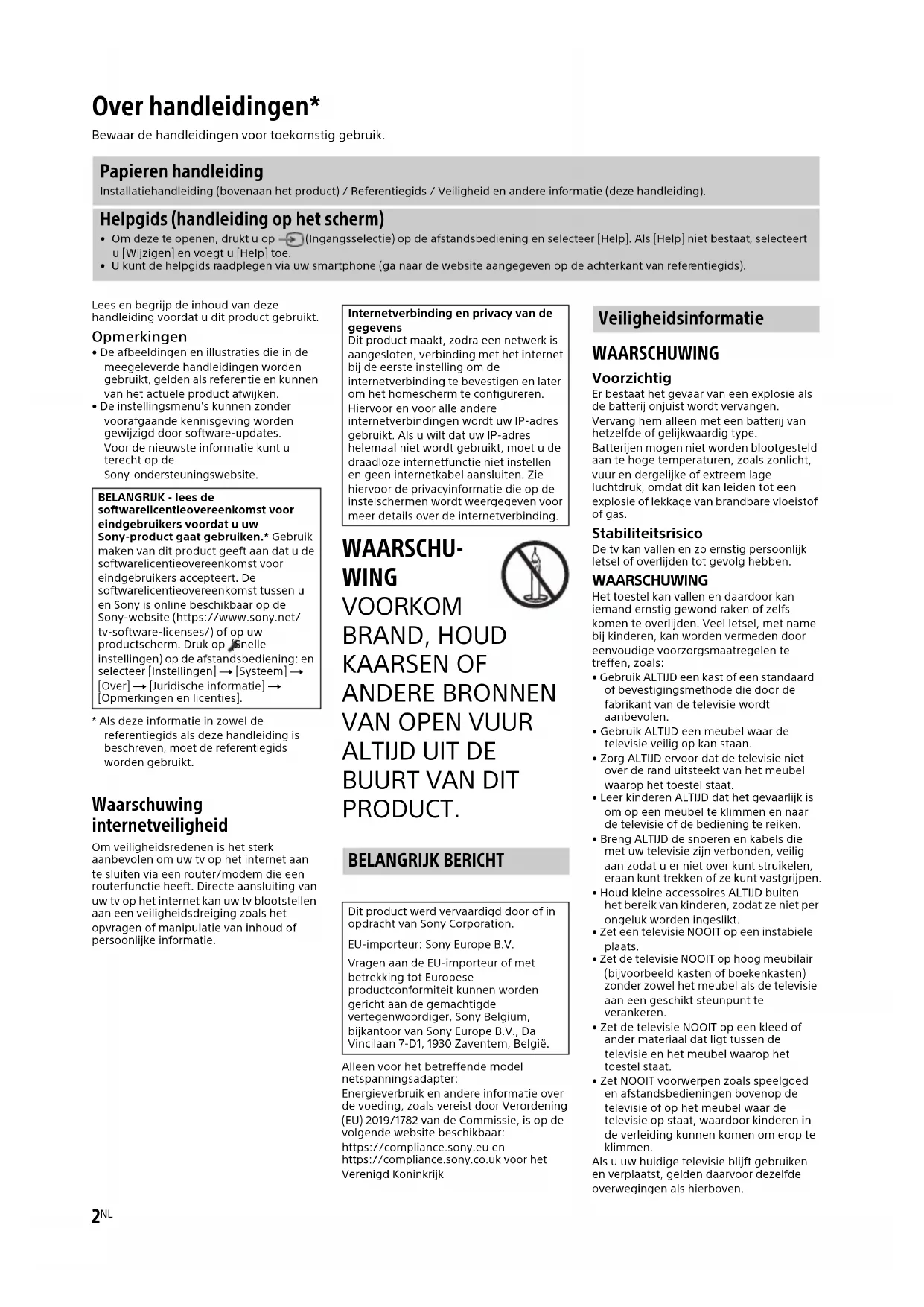 PRODUCT. Alleen voor het betreffende model netspanningsadapter:Energieverbruik en andere informatie over de voeding, zoals vereist door Verordening (EU) 2019/1782 van de Commissie, is op de volgende website beschikbaar:https://compliance.sony.eu enhttps://compliance.sony.co.uk voor het Verenigd Koninkrijk WAARSCHUWING Voorzichtig Er bestaat het gevaar van een explosie als de batterij onjuist wordt vervangen. Vervang hem alleen met een batterij van hetzelfde of gelijkwaardig type.Batterijen mogen niet worden blootgesteld aan te hoge temperaturen, zoals zonlicht, vuur en dergelijke of extreem lage luchtdruk, omdat dit kan leiden tot een explosie of lekkage van brandbare vloeistof of gas. Stabiliteitsrisico De tv kan vallen en zo ernstig persoonlijk letsel of overlijden tot gevolg hebben. WAARSCHUWING Het toestel kan vallen en daardoor kan iemand ernstig gewond raken of zelfs komen te overlijden. Veel letsel, met name bij kinderen, kan worden vermeden door eenvoudige voorzorgsmaatregelen te treffen, zoals:• Gebruik ALTIJD een kast of een standaard of bevestigingsmethode die door de fabrikant van de televisie wordt aanbevolen.• Gebruik ALTIJD een meubel waar de televisie veilig op kan staan.• Zorg ALTIJD ervoor dat de televisie niet over de rand uitsteekt van het meubel waarop het toestel staat.• Leer kinderen ALTIJD dat het gevaarlijk is om op een meubel te klimmen en naar de televisie of de bediening te reiken.• Breng ALTIJD de snoeren en kabels die met uw televisie zijn verbonden, veilig aan zodat u er niet over kunt struikelen, eraan kunt trekken of ze kunt vastgrijpen.• Houd kleine accessoires ALTIJD buiten het bereik van kinderen, zodat ze niet per ongeluk worden ingeslikt.• Zet een televisie NOOIT op een instabiele plaats.• Zet de televisie NOOIT op hoog meubilair (bijvoorbeeld kasten of boekenkasten) zonder zowel het meubel als de televisie aan een geschikt steunpunt te verankeren.• Zet de televisie NOOIT op een kleed of ander materiaal dat ligt tussen de televisie en het meubel waarop het toestel staat.• Zet NOOIT voorwerpen zoals speelgoed en afstandsbedieningen bovenop de televisie of op het meubel waar de televisie op staat, waardoor kinderen in de verleiding kunnen komen om erop te klimmen.Als u uw huidige televisie blijft gebruiken en verplaatst, gelden daarvoor dezelfde overwegingen als hierboven. Over handleidingen* Bewaar de handleidingen voor toekomstig gebruik. Papieren handleiding Installatiehandleiding (bovenaan het product) / Referentiegids / Veiligheid en andere informatie (deze handleiding). Helpgids (handleiding op het scherm)