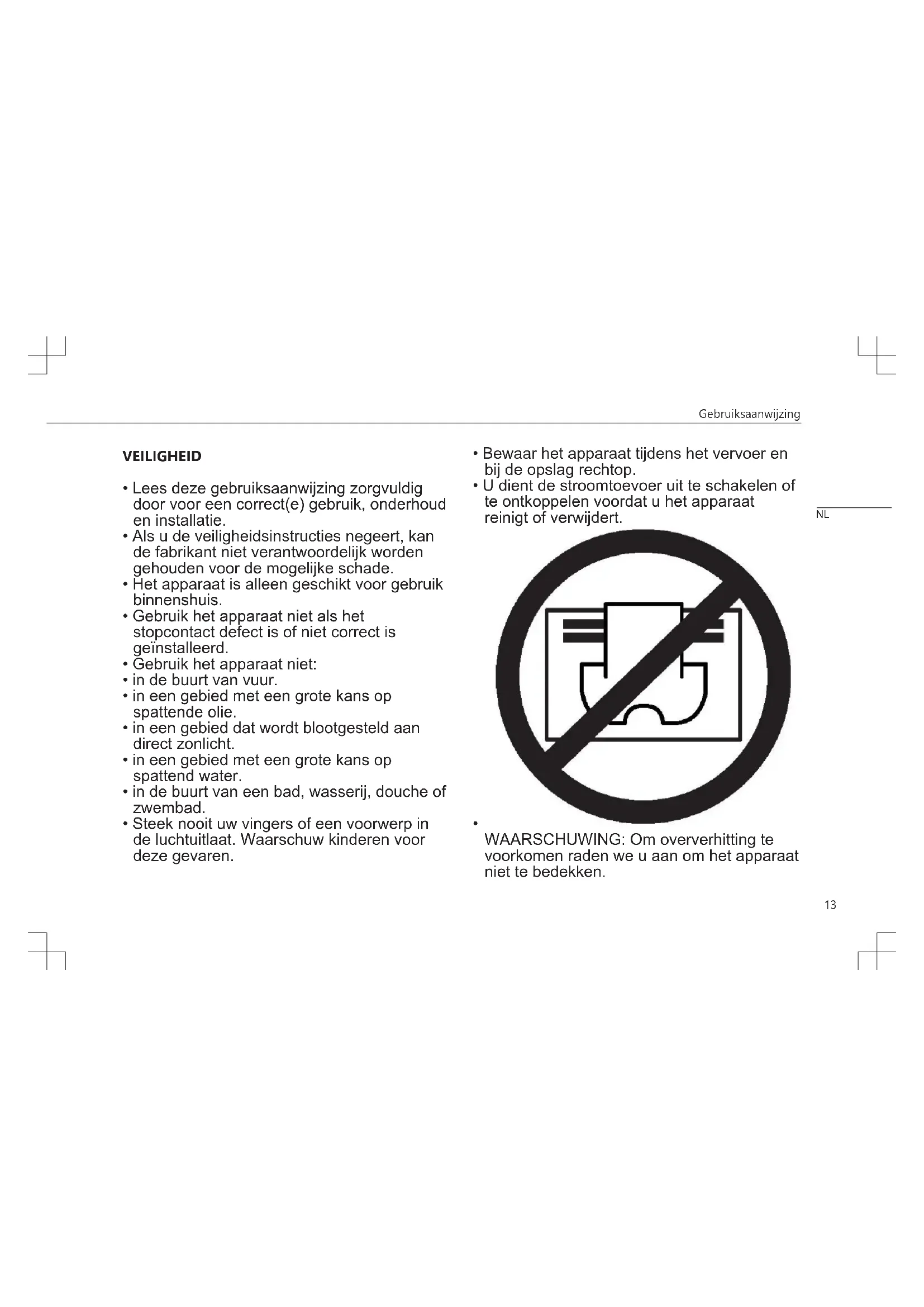 WAARSCHUWING: Om oververhitting te voorkomen raden we u aan om het apparaat niet te bedekken. NLGebruiksaanwijzing