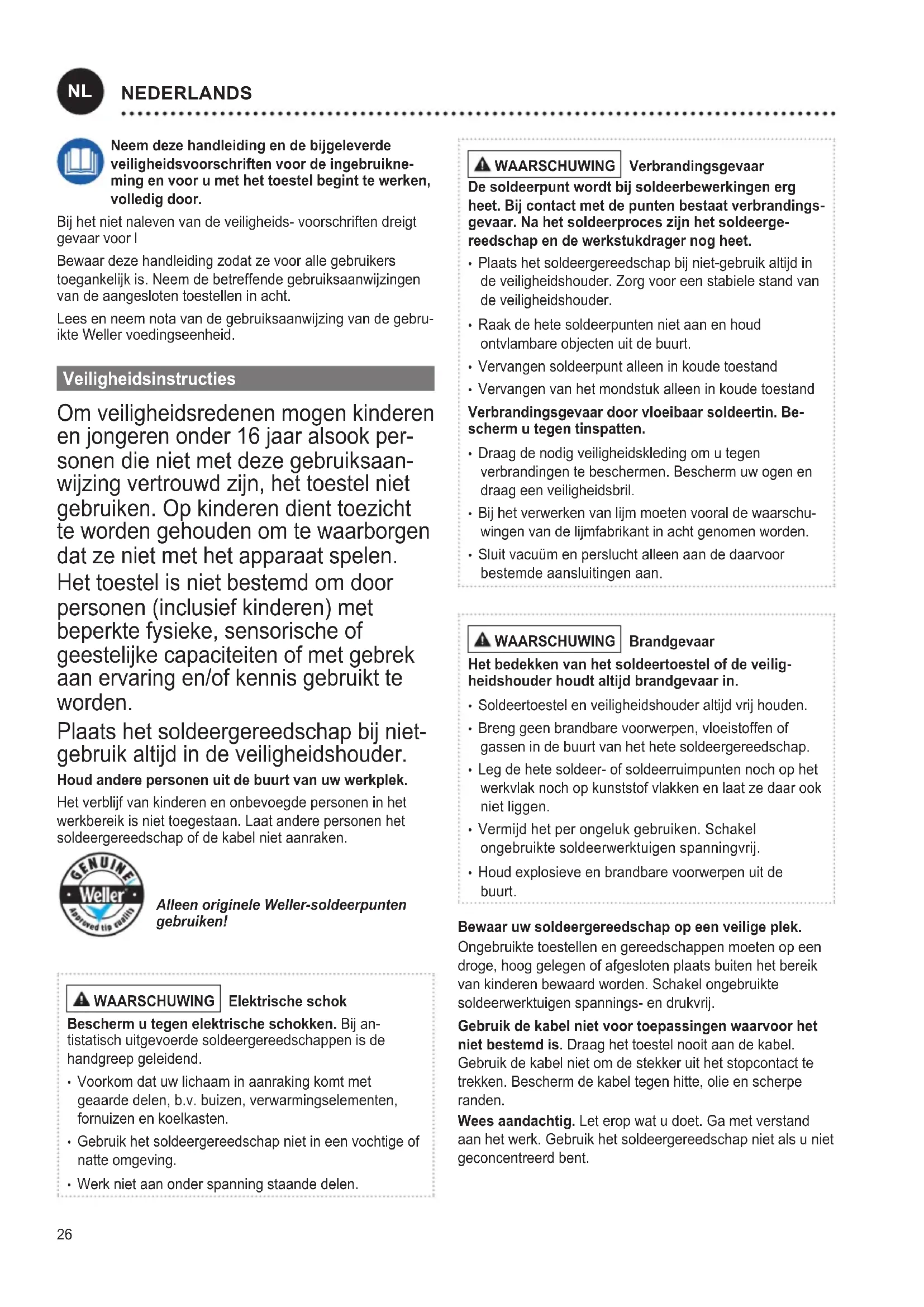 NEDERLANDS Vermijd abnormale lichaamshouding. Zorg voor een ergonomische werkplek. Vermijd houdingsfouten bij het werken, houdingsfouten veroorzaken houdingsschade. Het soldeergereedschap mag enkel in een technisch perfecte staat in gebruik genomen worden. Veiligheidsin- richtingen mogen niet buiten bedrijf gesteld worden. Storingen en defecten moeten onmiddellijk verholpen worden. Voor elk gebruik van het toestel/werktuig moeten veiligheidsinrichtingen zorgvuldig op hun perfecte en reglementaire werking onderzocht worden. Controleer of de bewegende delen perfect functioneren en niet klemmen en of delen beschadigd zijn. Alle delen moeten juist gemonteerd zijn en aan alle voorwaarden voldoen om het perfecte gebru- ik van het toestel te garanderen. Gebruik het juiste werktuig. Gebruik alleen toebehoren of hulptoestellen die in de toebehorenlijst vermeld of door de fabrikant vrijgegeven zijn. Gebruik WELLER toebehoren of hulptoestellen alleen aan originele WELLER-toestellen. Het gebruik van andere werktuigen en ander toebehoren kan verwondingsgevaar voor u betekenen. Beveilig het werktuig. Gebruik spaninrichtingen om het werkstuk vast te houden. Gebruik een soldeerrookafzuiging. Als inrichtingen voor het aansluiten van soldeerrookafzuigingen voorhanden zijn, controleer dan of deze aangesloten en juist gebruikt worden. Voorgeschreven Gebruik Van Het Systeem Gebruik de soldeerbout uitsluitend conform de in de gebru- iksaanwijzing beschreven bestemming voor het solderen en soldeerruimen onder de hier opgegeven omstandigheden. De soldeerbout mag alleen met de Weller voedingseenhe- den gebruikt worden. Dit toestal mag alleen bij kamertemperatuur en in binnen- ruimtes gebruikt worden. Tegen vocht en direct zonlicht beschermen. Gebruikersgroepen Wegens verschillend hoge risico‘s en gevaren mogen som- mige handelingen alleen door geschoolde vaklui uitgevoerd worden. Handeling Gebruikersgroepen Opgave van de soldeerpa- rameters Vakpersoneel met technische opleiding Vervangen van elektrische reserveonderdelen Elektrotechnicus Opgave van onderhouds- intervallen Veiligheidskracht Bedienen Wissel van de lter Leek Bedienen Wissel van de lter Vervangen van elektrische reserveonderdelen Technische leerling onder leiding en toezicht van een opgeleide vakman Onderhouden WAARSCHUWING Voor alle werkzaamheden aan het apparaat de stekker uit het stopcontact nemen. Toestel laten afkoelen. Controleer regelmatig alle aangesloten kabels en slangen. Beschadigde elektrische gereedschappen onmiddellijk buiten bedrijf stellen. Verstopte mondstukken mogen niet gebruikt worden. Reparaties moeten door personen uitgevoerd worden die door Weller zijn opgeleid. Gebruik alléén origineel toebehoren en originele onderdelen. WAARSCHUWING Verbrandingsgevaar