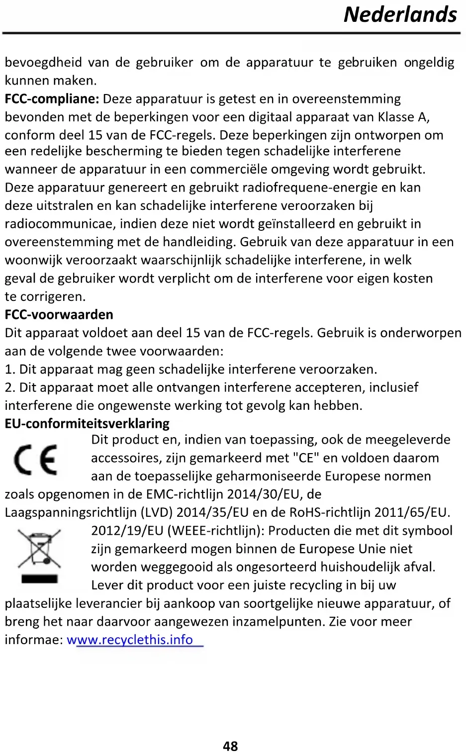 interferentie die ongewenste werking tot gevolg kan hebben. EU-conformiteitsverklaring Dit product en, indien van toepassing, ook de meegeleverde accessoires, zijn gemarkeerd met "CE" en voldoen daarom aan de toepasselijke geharmoniseerde Europese normen zoals opgenomen in de EMC-richtlijn 2014/30/EU, de Laagspanningsrichtlijn (LVD) 2014/35/EU en de RoHS-richtlijn 2011/65/EU. 2012/19/EU (WEEE-richtlijn): Producten die met dit symbool zijn gemarkeerd mogen binnen de Europese Unie niet worden weggegooid als ongesorteerd huishoudelijk afval. Lever dit product voor een juiste recycling in bij uw plaatselijke leverancier bij aankoop van soortgelijke nieuwe apparatuur, of breng het naar daarvoor aangewezen inzamelpunten. Zie voor meer informatie: www.recyclethis.infoNederlands