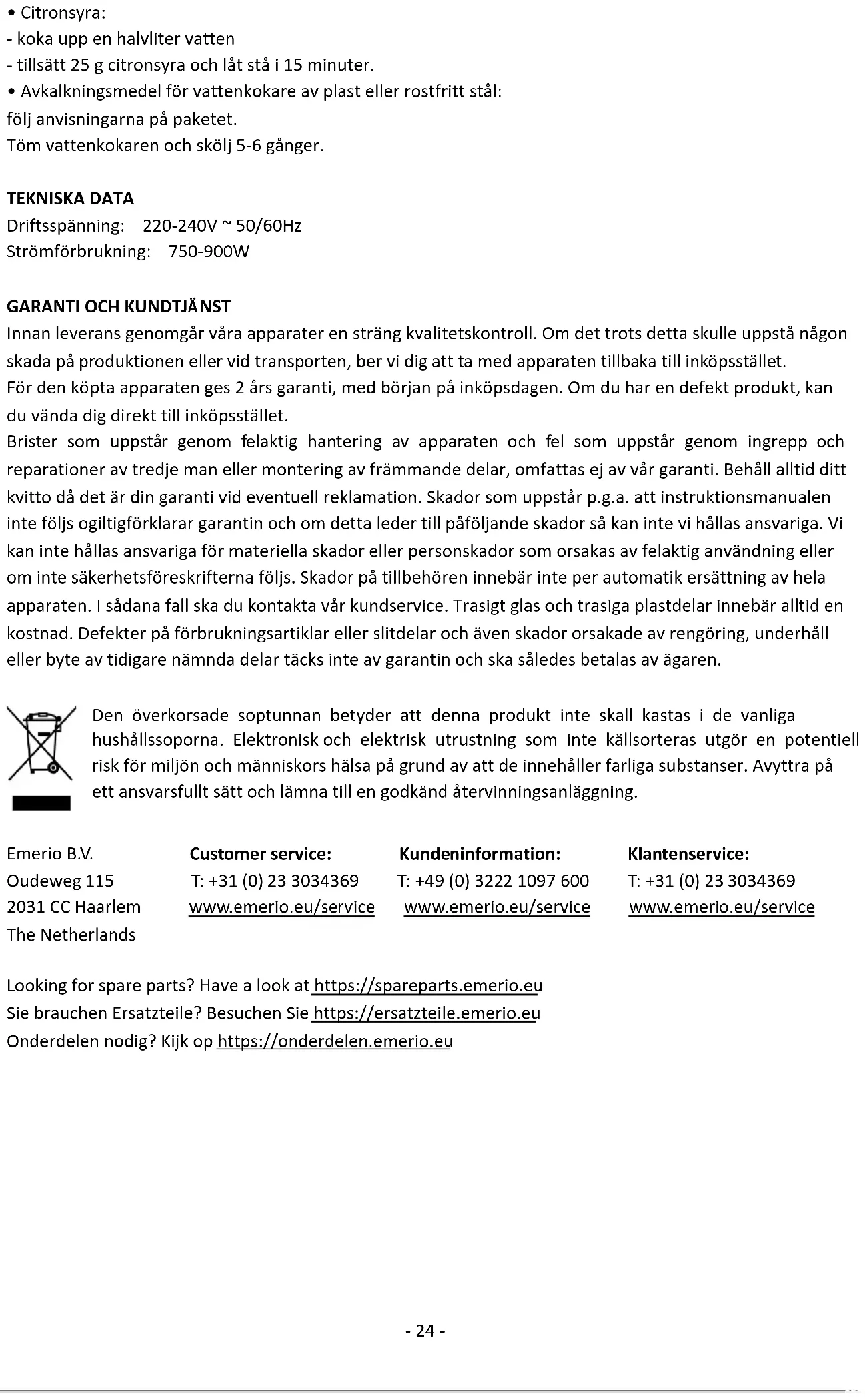 Vóór de levering worden onze apparaten streng gecontroleerd. Indien het toestel ondanks alle zorg bij de productie of tijdens het transport beschadigd werd, moet u het naar de handelaar terugbrengen. Wij geven een garantie van 2 jaar op het toestel, te beginnen met de koopdatum. Indien u een defect product heeft, kunt u rechtstreeks terug gaan naar het aankooppunt. Gebreken die het gevolg zijn van ondeskundig gebruik van het toestel, fouten tijdens ingrepen en reparaties door derden of door de inbouw van vreemde onderdelen, vallen niet onder deze garantie. Bewaar altijd uw aankoopnota, zonder aankoopnota kunt u geen aanspraak maken op enige vorm van garantie. Bij schade veroorzaakt door het niet opvolgen van de gebruiksaanwijzing vervalt het recht op garantie. Voor vervolgschade die hieruit ontstaat kunnen wij niet verantwoordelijk gehouden worden. Voor materiële schade of persoonlijk letsel veroorzaakt door ondeskundig gebruik of het niet opvolgen van de veiligheidsvoorschriften zijn wij niet aansprakelijk. In dergelijke gevallen vervalt iedere aanspraak op garantie. Schade aan accessoires of onderdelen betekend niet dat het gehele apparaat zal worden vervangen. Afgebroken glazen of kunststof onderdelen of accessoires vallen niet onder de garantie en zullen tegen vergoeding vervangen kunnen worden. Defecten aan hulpstukken of aan slijtage onderhevige onderdelen, alsmede reiniging, onderhoud of de vervanging van slijtende delen vallen niet onder de garantie en zullen dus in rekening gebracht worden. Het symbool van de doorgekruiste vuilniscontainer betekent dat dit product niet met het gewone huisvuil mag worden weggegooid. Elektronische en elektrische apparatuur die niet is opgenomen in het selectieve afvalsorteringsproces is potentieel gevaarlijk voor het milieu en de menselijke gezondheid vanwege de aanwezigheid van gevaarlijke stoffen. Voer deze op verantwoorde wijze af bij een erkend afvalverwerkings- of recyclingbedrijf. Emerio B.V. Customer service: Kundeninformation: Klantenservice: Oudeweg 115 T: +31 (0) 23 3034369 T: +49 (0) 3222 1097 600 T: +31 (0) 23 3034369 2031 CC Haarlem www.emerio.eu/service www.emerio.eu/service www.emerio.eu/service The Netherlands Looking for spare parts? Have a look at https://spareparts.emerio.eu Sie brauchen Ersatzteile? Besuchen Sie https://ersatzteile.emerio.eu Onderdelen nodig? Kijk op https://onderdelen.emerio.eu- 31 - Instrukcja obsługi – Polish