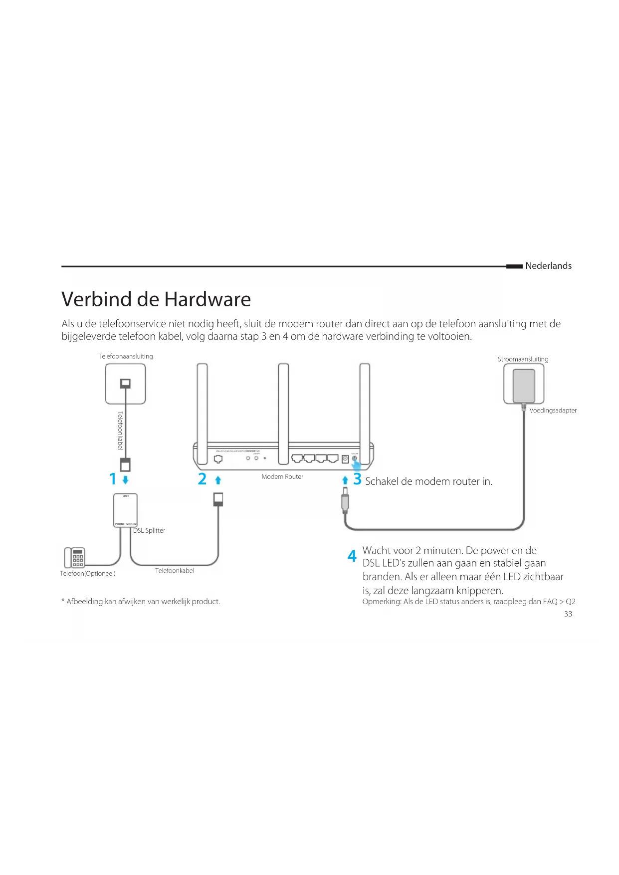 DSL LAN1 LAN2 LAN3 LAN4/WAN POWER POWERON/OFFWPS RESETWiFiON/OFF* Afbeelding kan afwijken van werkelijk product.TelefoonaansluitingTelefoonkabelTelefoonkabelModem Router Schakel de modem router in. StroomaansluitingVoedingsadapterDSL SplitterTelefoon(Optioneel)Opmerking: Als de LED status anders is, raadpleeg dan FAQ > Q2 Wacht voor 2 minuten. De power en de DSL LED’s zullen aan gaan en stabiel gaan branden. Als er alleen maar één LED zichtbaar is, zal deze langzaam knipperen.Nederlands