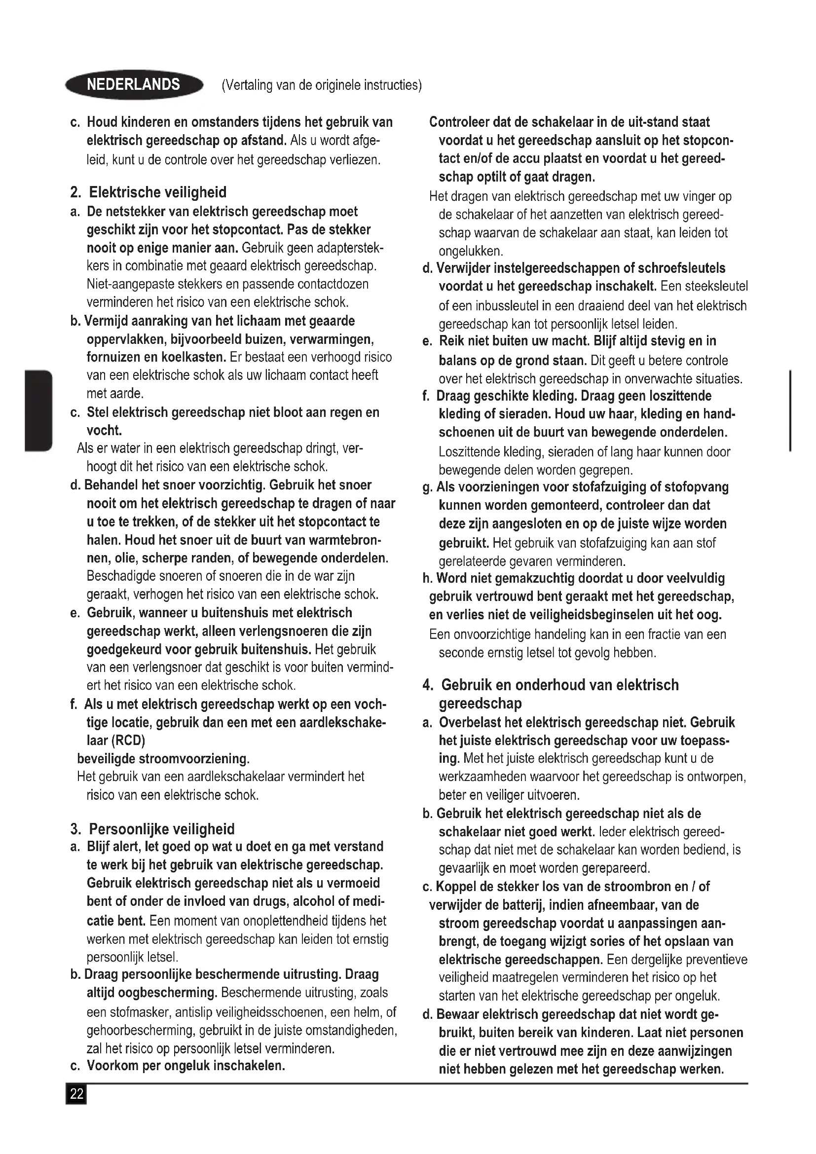 a. De netstekker van elektrisch gereedschap moet geschikt zijn voor het stopcontact. Pas de stekker nooit op enige manier aan. Gebruik geen adapterstek- kers in combinatie met geaard elektrisch gereedschap. Niet-aangepaste stekkers en passende contactdozen verminderen het risico van een elektrische schok. b. Vermijd aanraking van het lichaam met geaarde oppervlakken, bijvoorbeeld buizen, verwarmingen, fornuizen en koelkasten. Er bestaat een verhoogd risico van een elektrische schok als uw lichaam contact heeft met aarde. c. Stel elektrisch gereedschap niet bloot aan regen en vocht. Als er water in een elektrisch gereedschap dringt, ver- hoogt dit het risico van een elektrische schok. d. Behandel het snoer voorzichtig. Gebruik het snoer nooit om het elektrisch gereedschap te dragen of naar u toe te trekken, of de stekker uit het stopcontact te halen. Houd het snoer uit de buurt van warmtebron- nen, olie, scherpe randen, of bewegende onderdelen. Beschadigde snoeren of snoeren die in de war zijn geraakt, verhogen het risico van een elektrische schok. e. Gebruik, wanneer u buitenshuis met elektrisch gereedschap werkt, alleen verlengsnoeren die zijn goedgekeurd voor gebruik buitenshuis. Het gebruik van een verlengsnoer dat geschikt is voor buiten vermind- ert het risico van een elektrische schok. f. Als u met elektrisch gereedschap werkt op een voch- tige locatie, gebruik dan een met een aardlekschake- laar (RCD) beveiligde stroomvoorziening. Het gebruik van een aardlekschakelaar vermindert het risico van een elektrische schok.