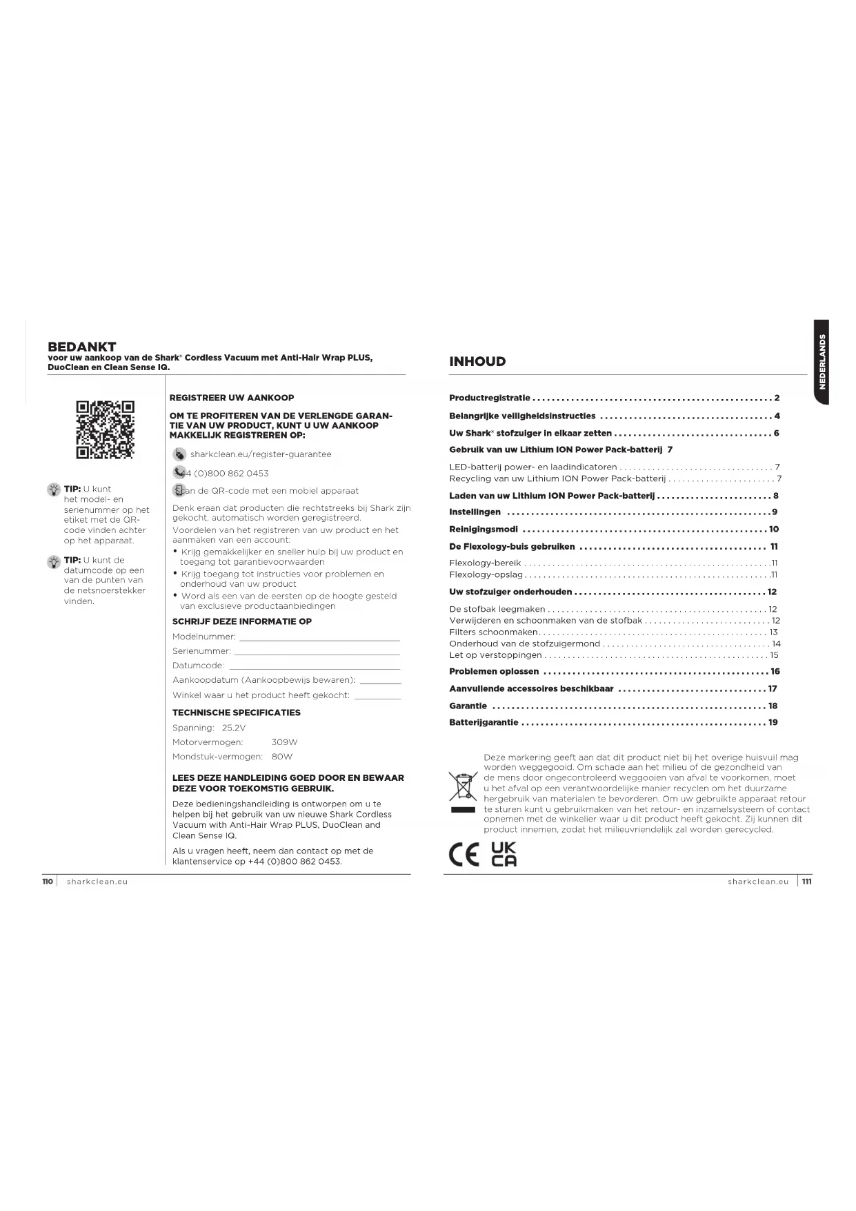 OM TE PROFITEREN VAN DE VERLENGDE GARAN- TIE VAN UW PRODUCT, KUNT U UW AANKOOP MAKKELIJK REGISTREREN OP: sharkclean.eu/register-guarantee +44 (0)800 862 0453 Scan de QR-code met een mobiel apparaat BEDANKT voor uw aankoop van de Shark® Cordless Vacuum met Anti-Hair Wrap PLUS, DuoClean en Clean Sense IQ. LEES DEZE HANDLEIDING GOED DOOR EN BEWAAR DEZE VOOR TOEKOMSTIG GEBRUIK. Deze bedieningshandleiding is ontworpen om u te helpen bij het gebruik van uw nieuwe Shark Cordless Vacuum with Anti-Hair Wrap PLUS, DuoClean and Clean Sense IQ Als u vragen heeft, neem dan contact op met de klantenservice op +44 (0)800 862 0453 Voordelen van het registreren van uw product en het aanmaken van een account: