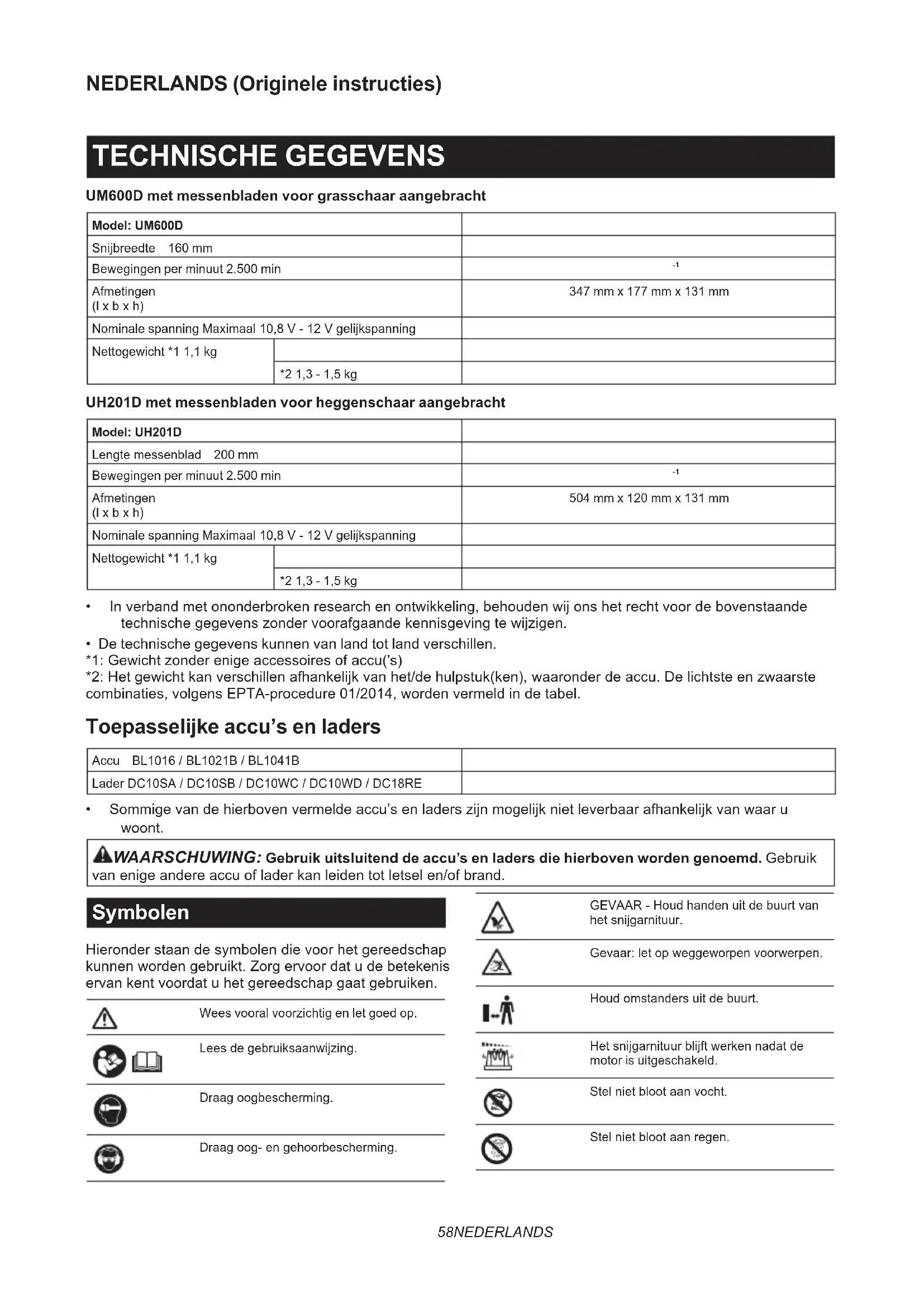 - Sommigevandehierbovenvermeldeaccu’senladerszijnmogelijknietleverbaarafhankelijkvanwaaru woont. WAARSCHUWING: Gebruik uitsluitend de accu’s en laders die hierboven worden genoemd.Gebruik vanenigeandereaccuofladerkanleidentotletselen/ofbrand. Symbolen Hieronderstaandesymbolendievoorhetgereedschap kunnenwordengebruikt.Zorgervoordatudebetekenis ervankentvoordatuhetgereedschapgaatgebruiken. Wees vooral voorzichtig en let goed op. Leesdegebruiksaanwijzing. Draagoogbescherming. Draagoog-engehoorbescherming. GEVAAR-Houdhandenuitdebuurtvan hetsnijgarnituur. Gevaar:letopweggeworpenvoorwerpen. Houdomstandersuitdebuurt. Hetsnijgarnituurblijftwerkennadatde motor is uitgeschakeld. Stelnietblootaanvocht. Stelnietblootaanregen.59 NEDERLANDS Ni-MH Li-ion AlleenvoorEU-landen Alsgevolgvandeaanwezigheidvan schadelijkecomponenteninhetapparaat, kunnen oude elektrische en elektronische apparaten,accu‘senbatterijennegatieve gevolgenhebbenvoorhetmilieuende gezondheid van mensen. Gooielektrischeenelektronischeappara- tenenaccu‘snietmethethuisvuilweg! InovereenstemmingmetdeEuropese richtlijninzakeoudeelektrischeenelek- tronische apparaten en inzake accu‘s en batterijenenoudeaccu‘senbatterijen, alsmededetoepassingdaarvanbinnen de nationale wetgeving, dienen oude elektrischeapparaten,accu‘senbatterijen gescheiden te worden opgeslagen en te wordeningeleverdbijeenapartinzame- lingspuntvoorhuishoudelijkafvaldatde milieubeschermingsvoorschrifteninacht neemt. Dit wordt op het apparaat aangegeven doorhetsymboolvaneendoorgekruiste afvalcontainer. Gegarandeerdgeluidsvermogenniveau conformEU-richtlijninzakegeluidsemissie buitenhuis. Geluidsvermogenniveauconformde RegelgevingGeluidsregelingvanNSW, Australië Gebruiksdoeleinden UM600D met messenbladen voor grasschaar aangebracht Hetgereedschapisbedoeldvoorhetbijsnijdenvan grasranden en grassprieten. UH201D met messenbladen voor heggenschaar aangebracht Hetgereedschapisbedoeldomheggentesnoeien. Geluidsniveau Detypische,A-gewogengeluidsniveauszijngemetenvolgensEN62841-4-5: UM600D/UH201D met messenbladen voor grasschaar aangebracht Geluidsdrukniveau