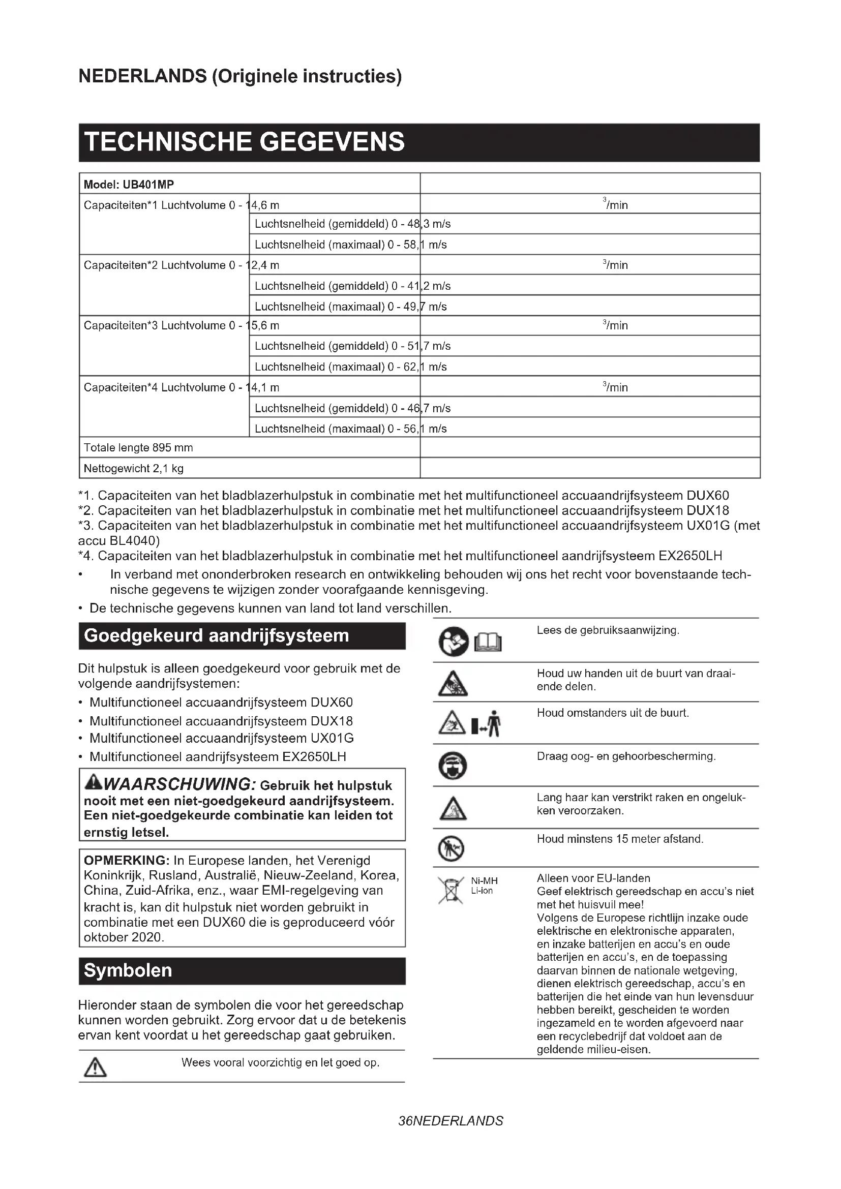 - Multifunctioneel aandrijfsysteem EX2650LH WAARSCHUWING: Gebruik het hulpstuk nooit met een niet-goedgekeurd aandrijfsysteem. Een niet-goedgekeurde combinatie kan leiden tot ernstig letsel. OPMERKING: In Europese landen, het Verenigd Koninkrijk, Rusland, Australië, Nieuw-Zeeland, Korea, China, Zuid-Afrika, enz., waar EMI-regelgeving van kracht is, kan dit hulpstuk niet worden gebruikt in combinatie met een DUX60 die is geproduceerd vóór oktober 2020. Symbolen Hieronder staan de symbolen die voor het gereedschap kunnen worden gebruikt. Zorg ervoor dat u de betekenis ervan kent voordat u het gereedschap gaat gebruiken. Wees vooral voorzichtig en let goed op. Lees de gebruiksaanwijzing. Houd uw handen uit de buurt van draai- ende delen. Houd omstanders uit de buurt. Draag oog- en gehoorbescherming. Lang haar kan verstrikt raken en ongeluk- ken veroorzaken. Houd minstens 15 meter afstand. Ni-MH Li-ion Alleen voor EU-landen Geef elektrisch gereedschap en accu’s niet met het huisvuil mee! Volgens de Europese richtlijn inzake oude elektrische en elektronische apparaten, en inzake batterijen en accu’s en oude batterijen en accu’s, en de toepassing daarvan binnen de nationale wetgeving, dienen elektrisch gereedschap, accu’s en batterijen die het einde van hun levensduur hebben bereikt, gescheiden te worden ingezameld en te worden afgevoerd naar een recyclebedrijf dat voldoet aan de geldende milieu-eisen.37 NEDERLANDS Gebruiksdoeleinden Dit hulpstuk is uitsluitend bedoeld voor het blazen van stof in combinatie met een goedgekeurd aandrijfsys- teem. Gebruik het hulpstuk nooit voor andere doelein- den. Misbruik van het hulpstuk kan leiden tot ernstig letsel. EG-verklaring van conformiteit Alleen voor Europese landen Wij als de fabrikanten: Makita Europe N.V., Bedrijfsadres: Jan-Baptist Vinkstraat 2, 3070 Kortenberg, BELGIË. Stellen Hiroshi Tsujimura aan om het technische bestand samen te stellen en verklaren onder eigen verantwoordelijkheid dat het/de product(en); Aanduiding: Bladblazerhulpstuk. Aanduiding van type(n): UB401MP. Voldoet aan de relevante voorwaarden van 2006/42/EG en tevens voldoet aan de relevante voorwaarden van de volgende EG/EU-richtlijnen: 2000/14/EC en zijn gefabri- ceerd in overeenstemming met de volgende geharmo- niseerde normen: EN 15503:2009+A1:2013+A2:2015, EN 50636-2-100:2014. Plaats en datum van verklaring: Kortenberg, België.