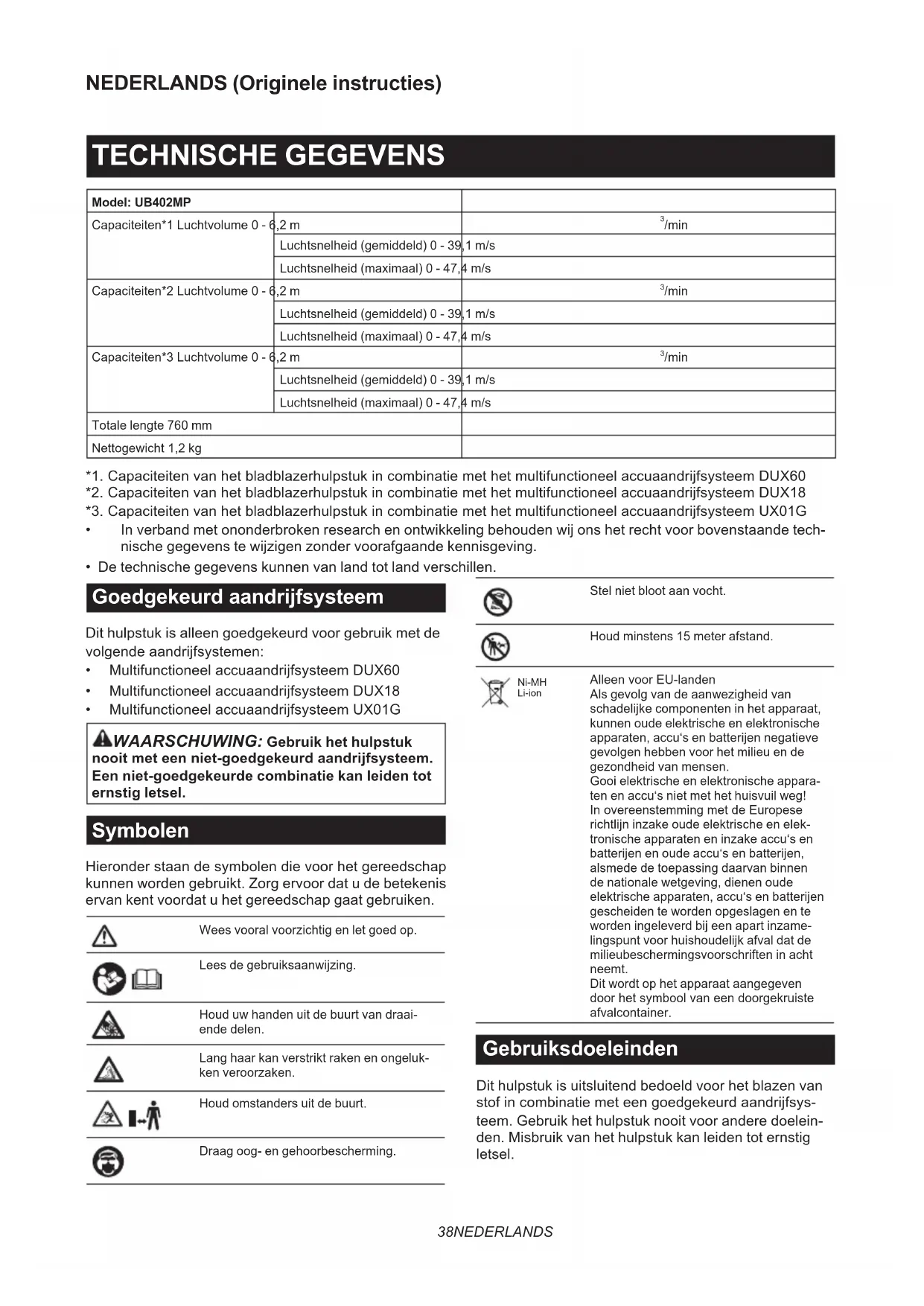 - MultifunctioneelaccuaandrijfsysteemUX01G WAARSCHUWING: Gebruik het hulpstuk nooit met een niet-goedgekeurd aandrijfsysteem. Een niet-goedgekeurde combinatie kan leiden tot ernstig letsel. Symbolen Hieronderstaandesymbolendievoorhetgereedschap kunnen worden gebruikt. Zorg ervoor dat u de betekenis ervan kent voordat u het gereedschap gaat gebruiken. Wees vooral voorzichtig en let goed op. Lees de gebruiksaanwijzing. Houd uw handen uit de buurt van draai- ende delen. Lang haar kan verstrikt raken en ongeluk- ken veroorzaken. Houd omstanders uit de buurt. Draag oog- en gehoorbescherming. Stel niet bloot aan vocht. Houd minstens 15 meter afstand. Ni-MH Li-ion AlleenvoorEU-landen Als gevolg van de aanwezigheid van schadelijke componenten in het apparaat, kunnen oude elektrische en elektronische apparaten, accu‘s en batterijen negatieve gevolgen hebben voor het milieu en de gezondheid van mensen. Gooi elektrische en elektronische appara- ten en accu‘s niet met het huisvuil weg! InovereenstemmingmetdeEuropese richtlijn inzake oude elektrische en elek- tronische apparaten en inzake accu‘s en batterijen en oude accu‘s en batterijen, alsmede de toepassing daarvan binnen de nationale wetgeving, dienen oude elektrische apparaten, accu‘s en batterijen gescheiden te worden opgeslagen en te worden ingeleverd bij een apart inzame- lingspunt voor huishoudelijk afval dat de milieubeschermingsvoorschriften in acht neemt. Dit wordt op het apparaat aangegeven doorhetsymboolvaneendoorgekruiste afvalcontainer. Gebruiksdoeleinden Dit hulpstuk is uitsluitend bedoeld voor het blazen van stofincombinatiemeteengoedgekeurdaandrijfsys- teem. Gebruik het hulpstuk nooit voor andere doelein- den. Misbruik van het hulpstuk kan leiden tot ernstig letsel.39 NEDERLANDS EG-verklaring van conformiteit Alleen voor Europese landen Wij als de fabrikanten: Makita Europe N.V., Bedrijfsadres: Jan-Baptist Vinkstraat 2, 3070 Kortenberg, BELGIË. Stellen Hiroshi Tsujimura aan om het technische bestand samen te stellen en verklaren onder eigen verantwoordelijkheid dat het/de product(en); Aanduiding: Bladblazerhulpstuk. Aanduiding van type(n):UB402MP. Voldoet aan de relevante voorwaarden van 2006/42/ EG en tevens voldoet aan de relevante voorwaarden vandevolgendeEG/EU-richtlijnen:2000/14/EC en zijn gefabriceerd in overeenstemming met de volgende geharmoniseerde normen: EN 60335-1:2012+A11: 2014+A13:2017+A1:2019+A14:2019+A2:2019, EN 50636-2-100:2014. Plaats en datum van verklaring: Kortenberg, België.