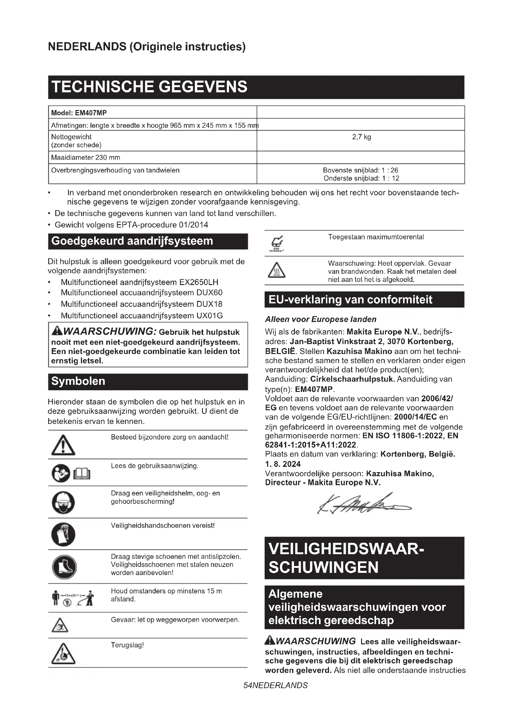 Houd omstanders op minstens 15 m afstand.Gevaar: let op weggeworpen voorwerpen.Terugslag!Toegestaan maximumtoerentalWaarschuwing: Heet oppervlak. Gevaar van brandwonden. Raak het metalen deel niet aan tot het is afgekoeld. EU-verklaring van conformiteit Alleen voor Europese landen Wijalsdefabrikanten:Makita Europe N.V.,bedrijfs- adres: Jan-Baptist Vinkstraat 2, 3070 Kortenberg, BELGIË. Stellen Kazuhisa Makino aan om het techni- sche bestand samen te stellen en verklaren onder eigen verantwoordelijkheiddathet/deproduct(en); Aanduiding: Cirkelschaarhulpstuk. Aanduiding van type(n):EM407MP. Voldoet aan de relevante voorwaarden van 2006/42/ EG en tevens voldoet aan de relevante voorwaarden vandevolgendeEG/EU-richtlijnen:2000/14/EC en zijngefabriceerdinovereenstemmingmetdevolgende geharmoniseerde normen: EN ISO 11806-1:2022, EN 62841-1:2015+A11:2022. Plaats en datum van verklaring: Kortenberg, België.