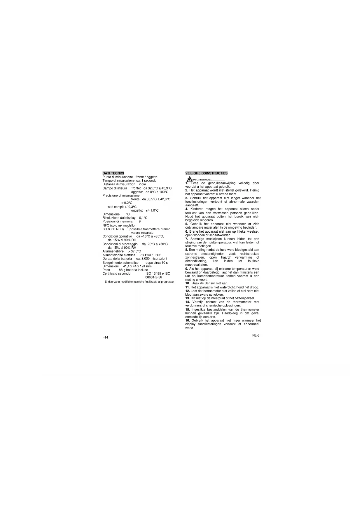 het openen van het batterijvak voor het vervangen van de batterij is toegestaan. NL-133. Vermijd direct zonlicht, hoge temperaturen, vocht, stof en sterke verontreiniging. TECHNISCHE GEGEVENS Meetlocatie voorhoofd Meetduur ca. 1 seconde Afstand voor de meting 2 cm Meetbereik voorhoofd: 32,2°C tot 43,3°C object: 0°C tot 100°C Meetnauwkeurig- heid voorhoofd: 35,5°C tot 42,0°C: +/-0,2°C andere bereiken: +/-0,3°C object: +/-1,0°C NFC (alleen bij de SC 8360 NFC) Laatste meetwaarde overdraagbaar Eenheid °C Resolutie van het display 0,1°C Geheugenplaatsen 9 Gebruikscondities +16°C tot +35°C, 15% tot 90% RH Opslagcondities -20°C tot +50°C, 15% tot 90% RH Stroomvoorziening 2 x R03, LR03 Levensduur van de batterij ca. 3.000 metingen Autom. uitschakeling na ca.10 seconden Afmetingen 41,4 x 44 x 124 mm Gewicht 88 g inclusief batterij Gecertificeerd volgens ISO 13485 en