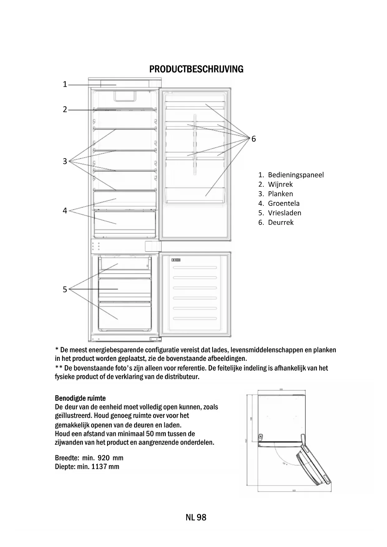 - De meest energiebesparende configuratie vereist dat lades, levensmiddelenschappen en planken in het product worden geplaatst, zie de bovenstaande afbeeldingen. ** De bovenstaande foto's zijn alleen voor referentie. De feitelijke indeling is afhankelijk van het fysieke product of de verklaring van de distributeur. Benodigde ruimte De deur van de eenheid moet volledig open kunnen, zoals geïllustreerd. Houd genoeg ruimte over voor het gemakkelijk openen van de deuren en laden. Houd een afstand van minimaal 50 mm tussen de zijwanden van het product en aangrenzende onderdelen. Breedte: min. 920 mm Diepte: min. 1137 mm
