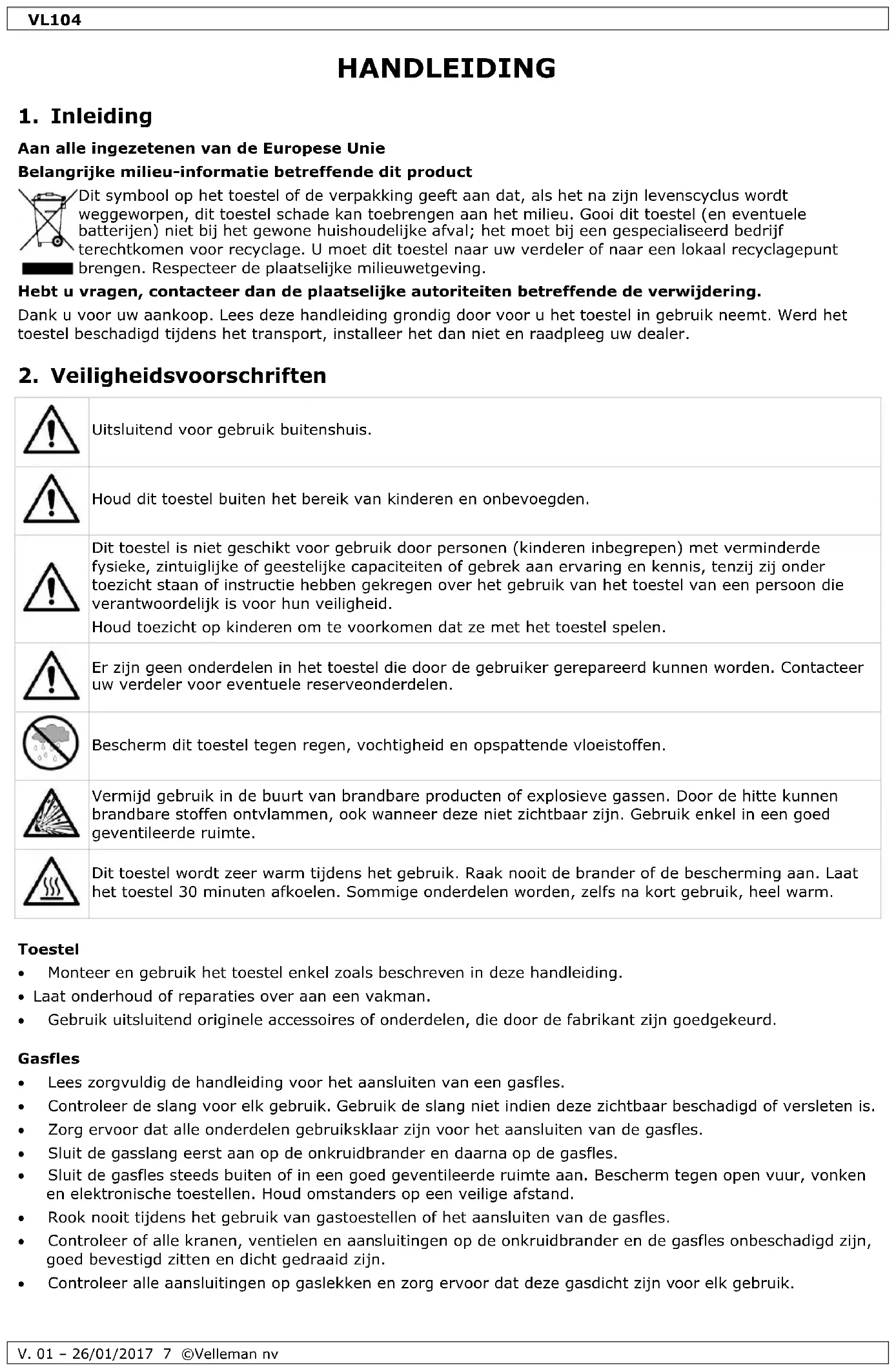 Dit toestel wordt zeer warm tijdens het gebruik. Raak nooit de brander of de bescherming aan. Laat het toestel 30 minuten afkoelen. Sommige onderdelen worden, zelfs na kort gebruik, heel warm. Toestel Monteer en gebruik het toestel enkel zoals beschreven in deze handleiding. Laat onderhoud of reparaties over aan een vakman. Gebruik uitsluitend originele accessoires of onderdelen, die door de fabrikant zijn goedgekeurd. Gasfles Lees zorgvuldig de handleiding voor het aansluiten van een gasfles. Controleer de slang voor elk gebruik. Gebruik de slang niet indien deze zichtbaar beschadigd of versleten is. Zorg ervoor dat alle onderdelen gebruiksklaar zijn voor het aansluiten van de gasfles. Sluit de gasslang eerst aan op de onkruidbrander en daarna op de gasfles. Sluit de gasfles steeds buiten of in een goed geventileerde ruimte aan. Bescherm tegen open vuur, vonken en elektronische toestellen. Houd omstanders op een veilige afstand. Rook nooit tijdens het gebruik van gastoestellen of het aansluiten van de gasfles. Controleer of alle kranen, ventielen en aansluitingen op de onkruidbrander en de gasfles onbeschadigd zijn, goed bevestigd zitten en dicht gedraaid zijn. Controleer alle aansluitingen op gaslekken en zorg ervoor dat deze gasdicht zijn voor elk gebruik.VL104