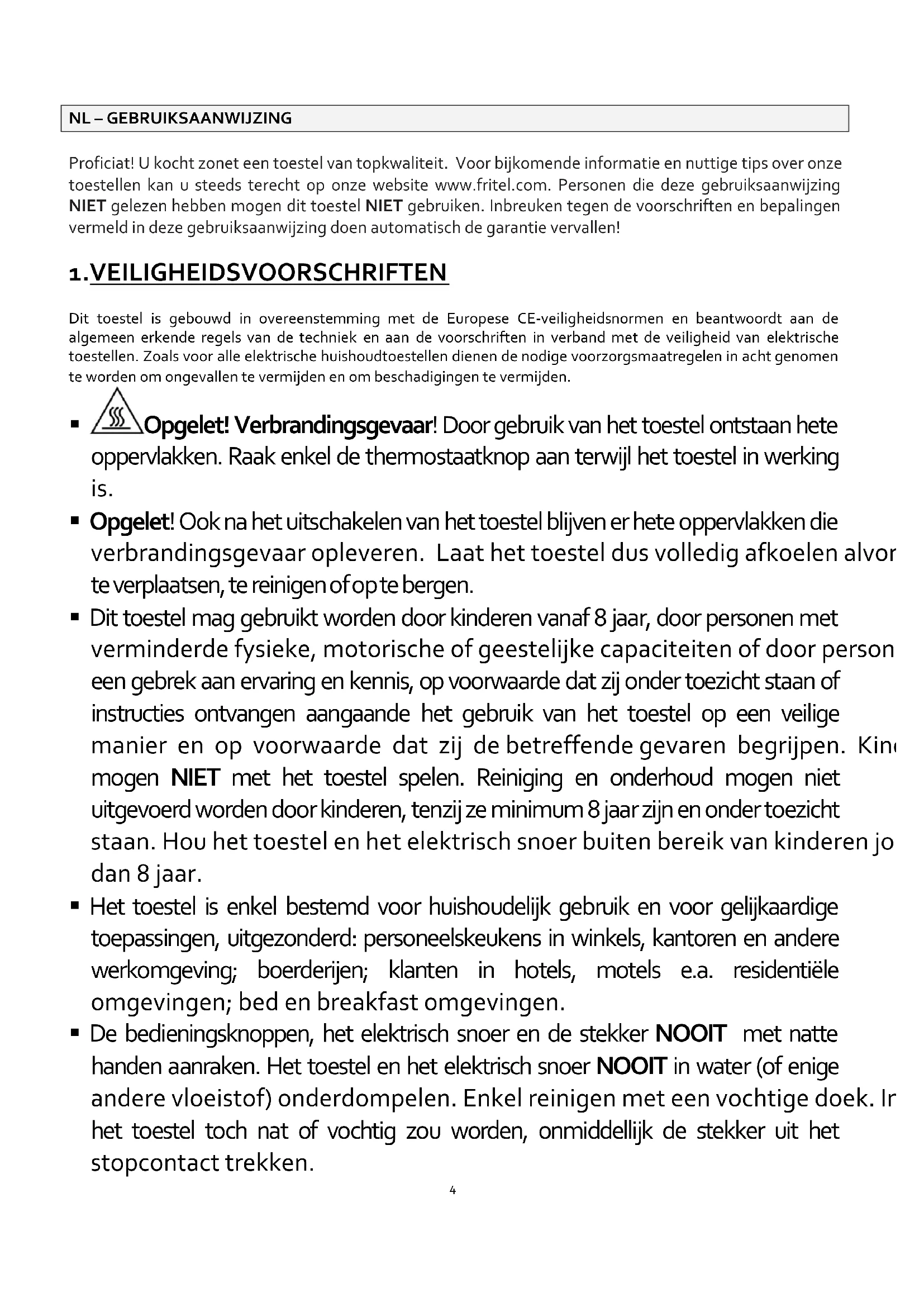 NL – GEBRUIKSAANWIJZING Proficiat! U kocht zonet een toestel van topkwaliteit. Voor bijkomende informatie en nuttige tips over onze toestellen kan u steeds terecht op onze website www.fritel.com. Personen die deze gebruiksaanwijzing NIET gelezen hebben mogen dit toestel NIET gebruiken. Inbreuken tegen de voorschriften en bepalingen vermeld in deze gebruiksaanwijzing doen automatisch de garantie vervallen! 1.VEILIGHEIDSVOORSCHRIFTEN Dit toestel is gebouwd in overeenstemming met de Europese CE-veiligheidsnormen en beantwoordt aan de algemeen erkende regels van de techniek en aan de voorschriften in verband met de veiligheid van elektrische toestellen. Zoals voor alle elektrische huishoudtoestellen dienen de nodige voorzorgsmaatregelen in acht genomen te worden om ongevallen te vermijden en om beschadigingen te vermijden.