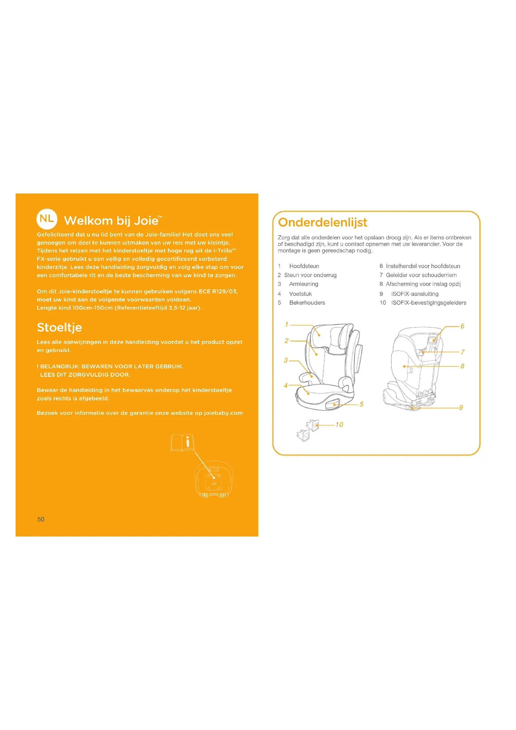 Gefeliciteerd dat u nu lid bent van de Joie-familie! Het doet ons veel genoegen om deel te kunnen uitmaken van uw reis met uw kleintje. Tijdens het reizen met het kinderstoeltje met hoge rug uit de i-Trillo™ FX-serie gebruikt u een veilig en volledig gecertificeerd verbeterd kinderzitje. Lees deze handleiding zorgvuldig en volg elke stap om voor een comfortabele rit en de beste bescherming van uw kind te zorgen.Om dit Joie-kinderstoeltje te kunnen gebruiken volgens ECE R129/03, moet uw kind aan de volgende voorwaarden voldoen.Lengte kind 100cm-150cm (Referentieleeftijd 3,5-12 jaar). Stoeltje Lees alle aanwijzingen in deze handleiding voordat u het product opzet en gebruikt.! BELANGRIJK: BEWAREN VOOR LATER GEBRUIK. LEES DIT ZORGVULDIG DOOR.Bewaar de handleiding in het bewaarvak onderop het kinderstoeltje zoals rechts is afgebeeld.Bezoek voor informatie over de garantie onze website op joiebaby.com