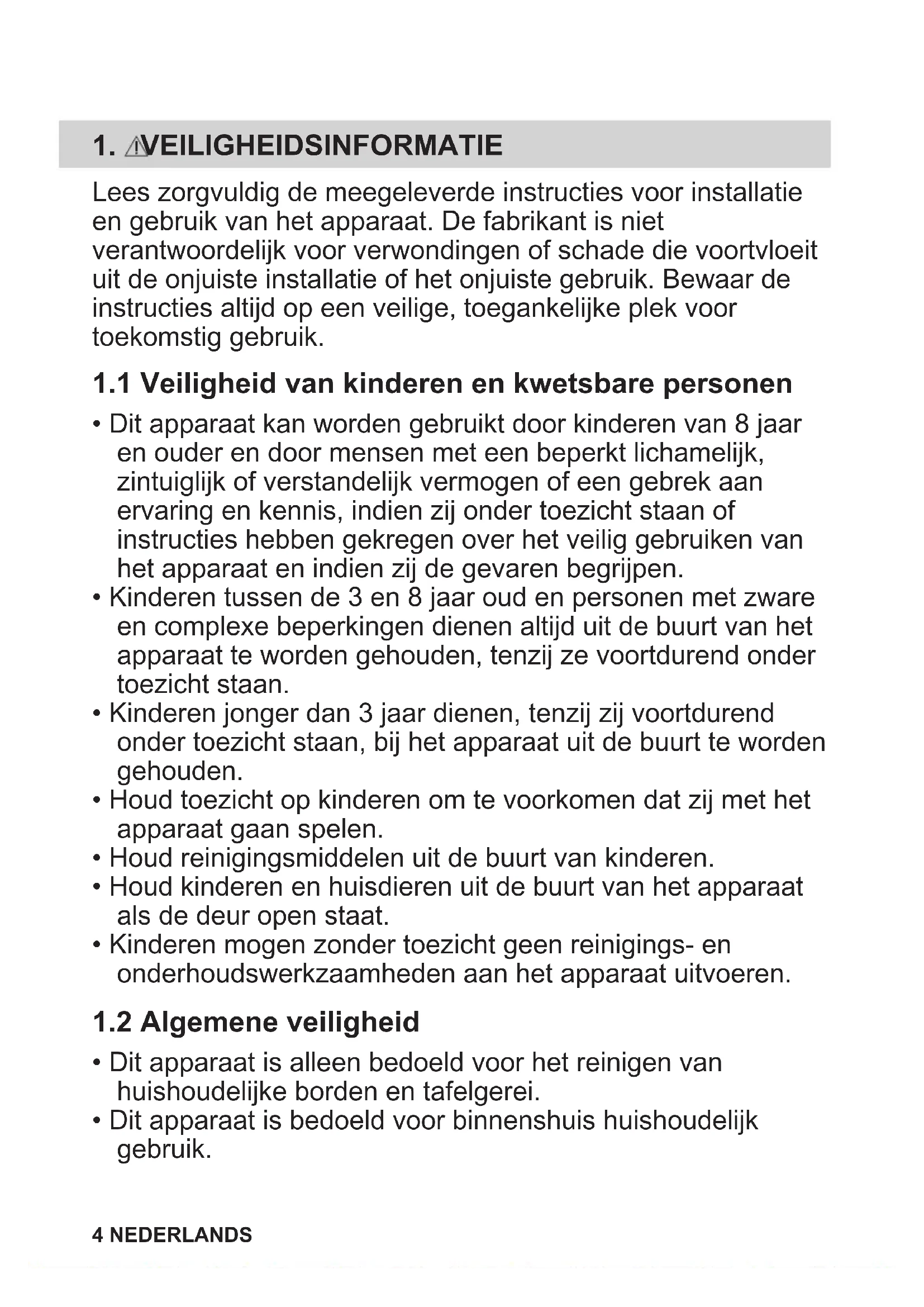 - Dit apparaat kan worden gebruikt door kinderen van 8 jaar en ouder en door mensen met een beperkt lichamelijk, zintuiglijk of verstandelijk vermogen of een gebrek aan ervaring en kennis, indien zij onder toezicht staan of instructies hebben gekregen over het veilig gebruiken van het apparaat en indien zij de gevaren begrijpen.