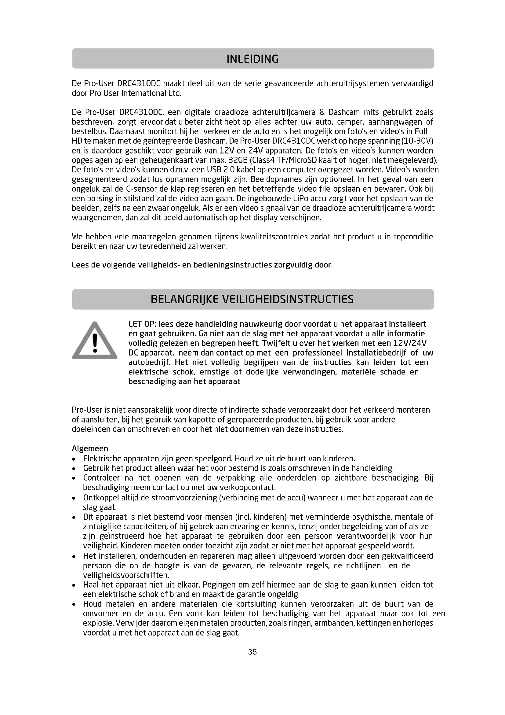 De Pro-User DRC4310DC maakt deel uit van de serie geavanceerde achteruitrijsystemen vervaardigd door Pro User International Ltd. De Pro-User DRC4310DC, een digitale draadloze achteruitrijcamera & Dashcam mits gebruikt zoals beschreven, zorgt ervoor dat u beter zicht hebt op alles achter uw auto, camper, aanhangwagen of bestelbus. Daarnaast monitort hij het verkeer en de auto en is het mogelijk om foto’s en video’s in Full HD te maken met de geïntegreerde Dashcam. De Pro-User DRC4310DC werkt op hoge spanning (10-30V) en is daardoor geschikt voor gebruik van 12V en 24V apparaten. De foto’s en video’s kunnen worden opgeslagen op een geheugenkaart van max. 32GB (Class4 TF/MicroSD kaart of hoger, niet meegeleverd). De foto’s en video’s kunnen d.m.v. een USB 2.0 kabel op een computer overgezet worden. Video’s worden gesegmenteerd zodat lus opnamen mogelijk zijn. Beeldopnames zijn optioneel. In het geval van een ongeluk zal de G-sensor de klap regisseren en het betreffende video file opslaan en bewaren. Ook bij een botsing in stilstand zal de video aan gaan. De ingebouwde LiPo accu zorgt voor het opslaan van de beelden, zelfs na een zwaar ongeluk. Als er een video signaal van de draadloze achteruitrijcamera wordt waargenomen, dan zal dit beeld automatisch op het display verschijnen. We hebben vele maatregelen genomen tijdens kwaliteitscontroles zodat het product u in topconditie bereikt en naar uw tevredenheid zal werken. Lees de volgende veiligheids- en bedieningsinstructies zorgvuldig door.