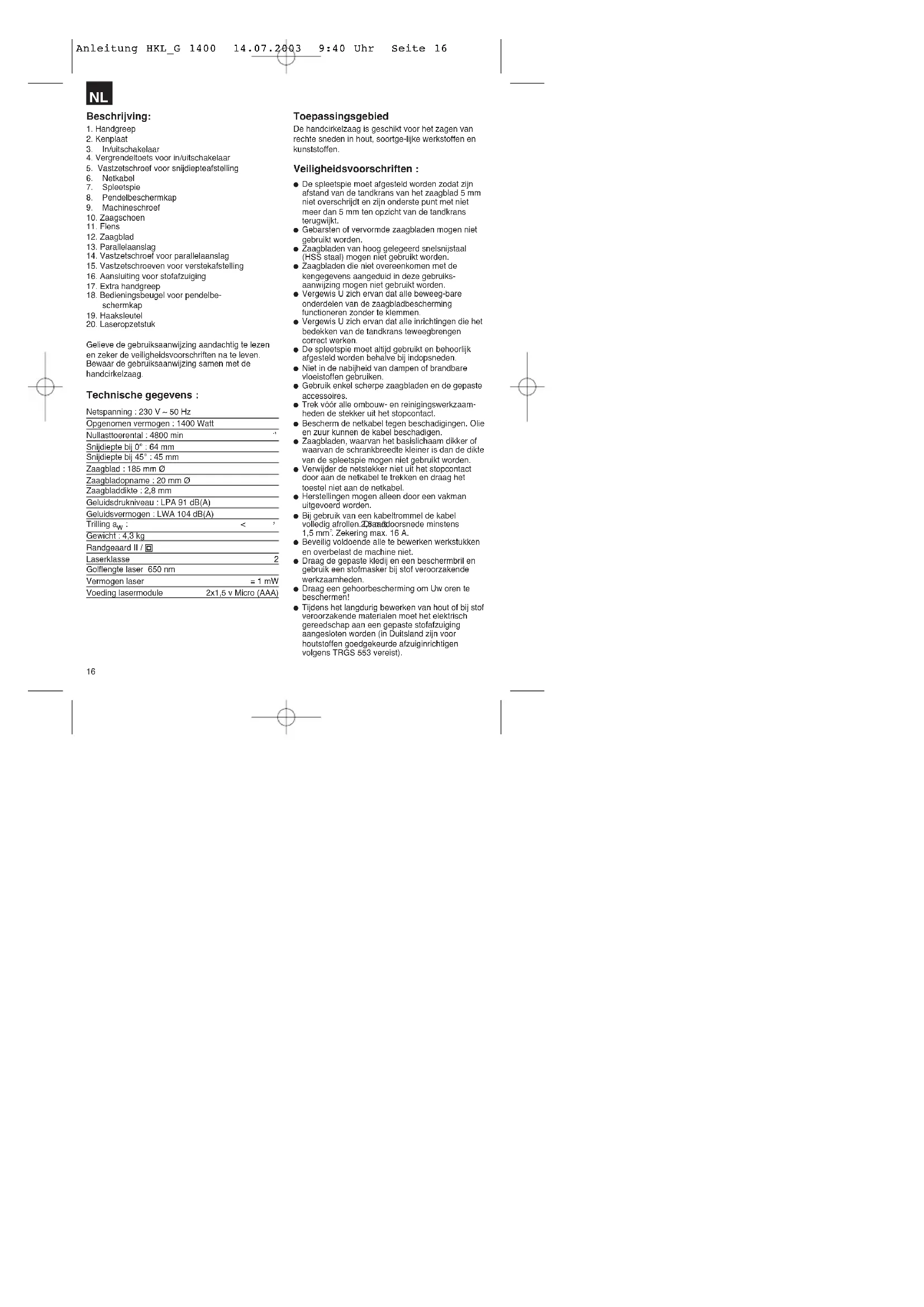 . Zekering max. 16 A. Beveilig voldoende alle te bewerken werkstukken en overbelast de machine niet. Draag de gepaste kledij en een beschermbril en gebruik een stofmasker bij stof veroorzakende werkzaamheden. Draag een gehoorbescherming om Uw oren te beschermen! Tijdens het langdurig bewerken van hout of bij stof veroorzakende materialen moet het elektrisch gereedschap aan een gepaste stofafzuiging aangesloten worden (in Duitsland zijn voor houtstoffen goedgekeurde afzuiginrichtigen volgens TRGS 553 vereist). Anleitung HKL_G 1400 14.07.2003 9:40 Uhr Seite 1617