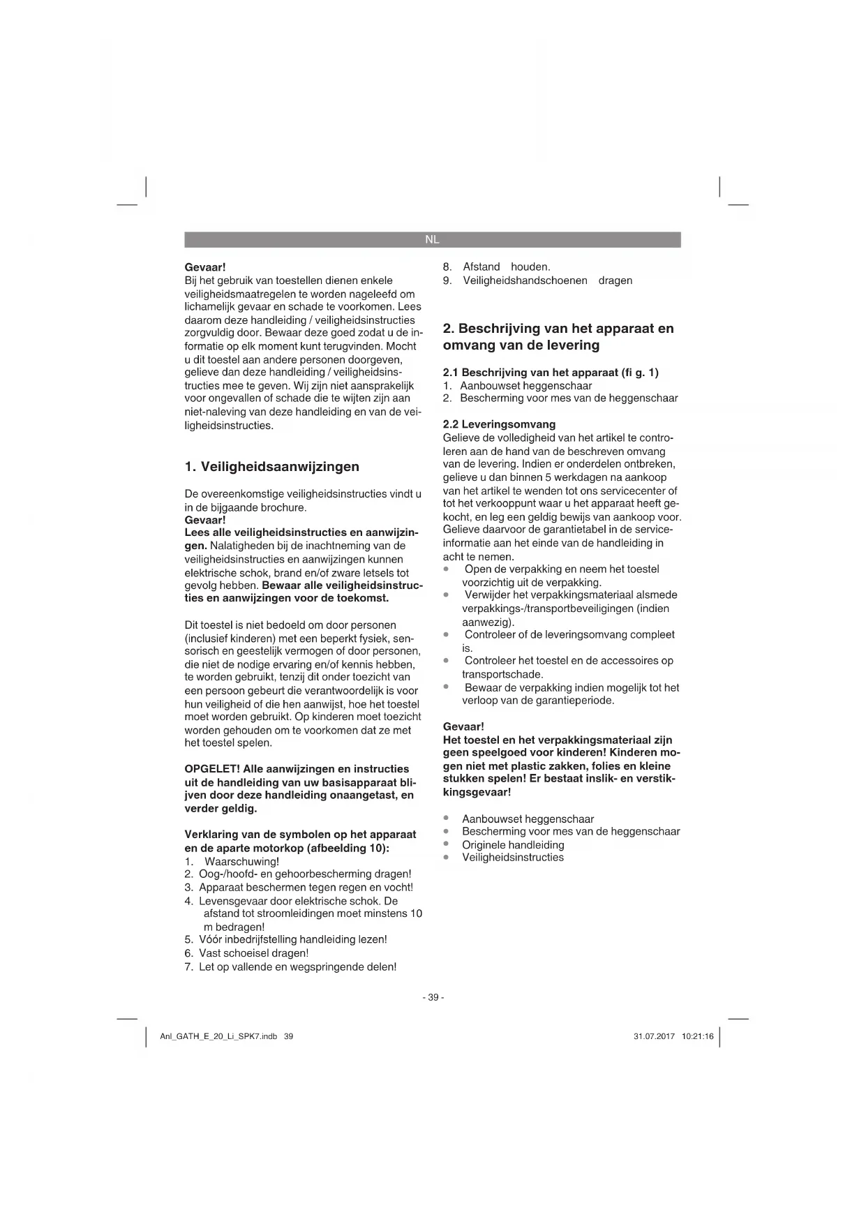 Enkel voor EU-landen Elektrisch gereedschap hoort niet bij het huisvuil thuis! Volgens de Europese richtlijn 2012/19/EG op afgedankte elektrische en elektronische toestellen en omzetting in nationaal recht dienen afgedankte elektrische gereedschappen afzonderlijk te worden ver- zameld en milieuvriendelijk te worden gerecycleerd. Recyclagealternatief i.p.v. het toestel terug te sturen: De eigenaar van het elektrische toestel is alternatief verplicht, i.p.v. het toestel terug te sturen, mede te werken bij de behoorlijke recyclage in geval hij zich van het eigendom ontdoet. Het afgedankte toestel kan hiervoor ook bij een verzamelplaats worden afgegeven die voor een verwijdering als bedoeld in de wetgeving in zake recyclage en afvalverwerking zorgt. Hieronder vallen niet bij de afgedankte toestellen gevoegde accessoires en hulpmiddelen zonder elektrische componenten. Nadruk of andere reproductie van documentatie en geleidepapieren van de producten, geheel of ge- deeltelijk, enkel toegestaan mits uitdrukkelijke toestemming van iSC GmbH. Technische wijzigingen voorbehouden Anl_GATH_E_20_Li_SPK7.indb 43Anl_GATH_E_20_Li_SPK7.indb 43 31.07.2017 10:21:1731.07.2017 10:21:17NL