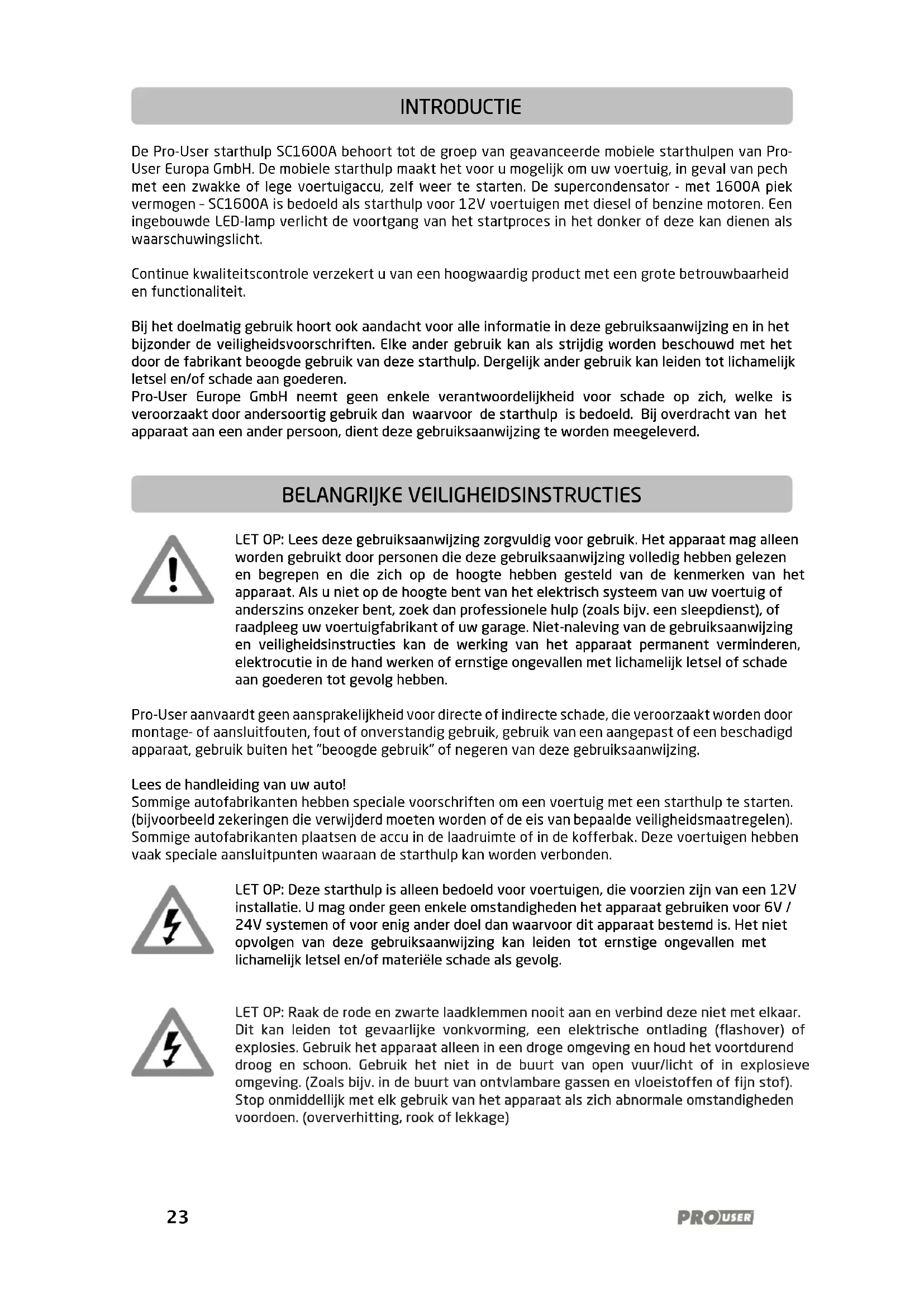 LET OP: Lees deze gebruiksaanwijzing zorgvuldig voor gebruik. Het apparaat mag alleen worden gebruikt door personen die deze gebruiksaanwijzing volledig hebben gelezen en begrepen en die zich op de hoogte hebben gesteld van de kenmerken van het apparaat. Als u niet op de hoogte bent van het elektrisch systeem van uw voertuig of anderszins onzeker bent, zoek dan professionele hulp (zoals bijv. een sleepdienst), of raadpleeg uw voertuigfabrikant of uw garage. Niet-naleving van de gebruiksaanwijzing en veiligheidsinstructies kan de werking van het apparaat permanent verminderen, elektrocutie in de hand werken of ernstige ongevallen met lichamelijk letsel of schade aan goederen tot gevolg hebben. Pro-User aanvaardt geen aansprakelijkheid voor directe of indirecte schade, die veroorzaakt worden door montage- of aansluitfouten, fout of onverstandig gebruik, gebruik van een aangepast of een beschadigd apparaat, gebruik buiten het "beoogde gebruik" of negeren van deze gebruiksaanwijzing. Lees de handleiding van uw auto! Sommige autofabrikanten hebben speciale voorschriften om een voertuig met een starthulp te starten. (bijvoorbeeld zekeringen die verwijderd moeten worden of de eis van bepaalde veiligheidsmaatregelen). Sommige autofabrikanten plaatsen de accu in de laadruimte of in de kofferbak. Deze voertuigen hebben vaak speciale aansluitpunten waaraan de starthulp kan worden verbonden. LET OP: Deze starthulp is alleen bedoeld voor voertuigen, die voorzien zijn van een 12V installatie. U mag onder geen enkele omstandigheden het apparaat gebruiken voor 6V / 24V systemen of voor enig ander doel dan waarvoor dit apparaat bestemd is. Het niet opvolgen van deze gebruiksaanwijzing kan leiden tot ernstige ongevallen met lichamelijk letsel en/of materiële schade als gevolg.