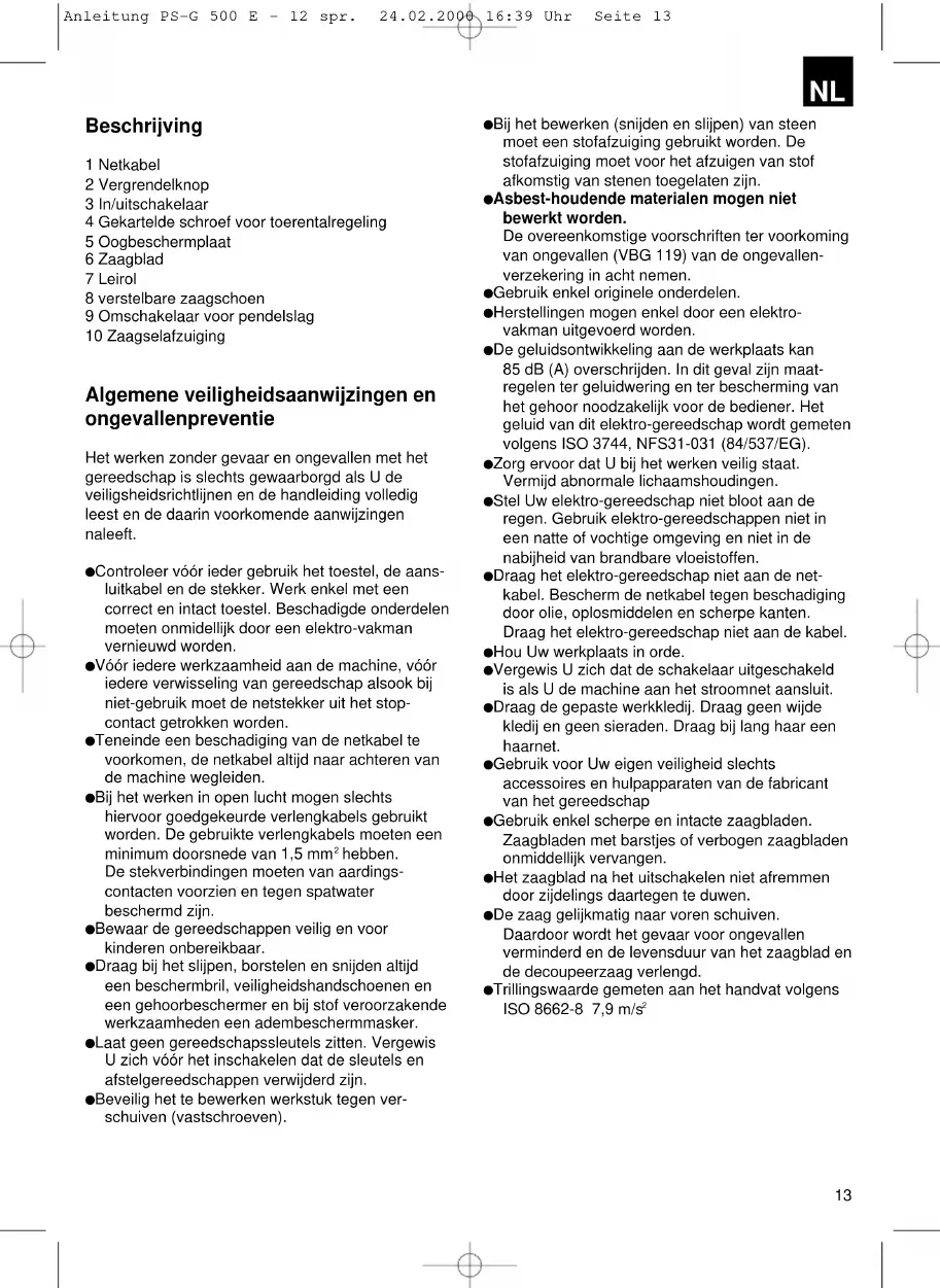 Réglage de la course pendulaire Pos. 0 aucun mouvement pendulaire Pos. 1 léger mouvement pendulaire Pos. 2 moyen mouvement pendulaire Anleitung PS-G 500 E - 12 spr. 24.02.2000 16:39 Uhr Seite 1213 Beschrijving 1 Netkabel 2 Vergrendelknop 3 In/uitschakelaar 4 Gekartelde schroef voor toerentalregeling 5 Oogbeschermplaat 6 Zaagblad 7 Leirol 8 verstelbare zaagschoen 9 Omschakelaar voor pendelslag 10 Zaagselafzuiging Algemene veiligheidsaanwijzingen en ongevallenpreventie Het werken zonder gevaar en ongevallen met het gereedschap is slechts gewaarborgd als U de veiligsheidsrichtlijnen en de handleiding volledig leest en de daarin voorkomende aanwijzingen naleeft. Controleer vóór ieder gebruik het toestel, de aans- luitkabel en de stekker. Werk enkel met een correct en intact toestel. Beschadigde onderdelen moeten onmidellijk door een elektro-vakman vernieuwd worden. Vóór iedere werkzaamheid aan de machine, vóór iedere verwisseling van gereedschap alsook bij niet-gebruik moet de netstekker uit het stop- contact getrokken worden. Teneinde een beschadiging van de netkabel te voorkomen, de netkabel altijd naar achteren van de machine wegleiden. Bij het werken in open lucht mogen slechts hiervoor goedgekeurde verlengkabels gebruikt worden. De gebruikte verlengkabels moeten een minimum doorsnede van 1,5 mm