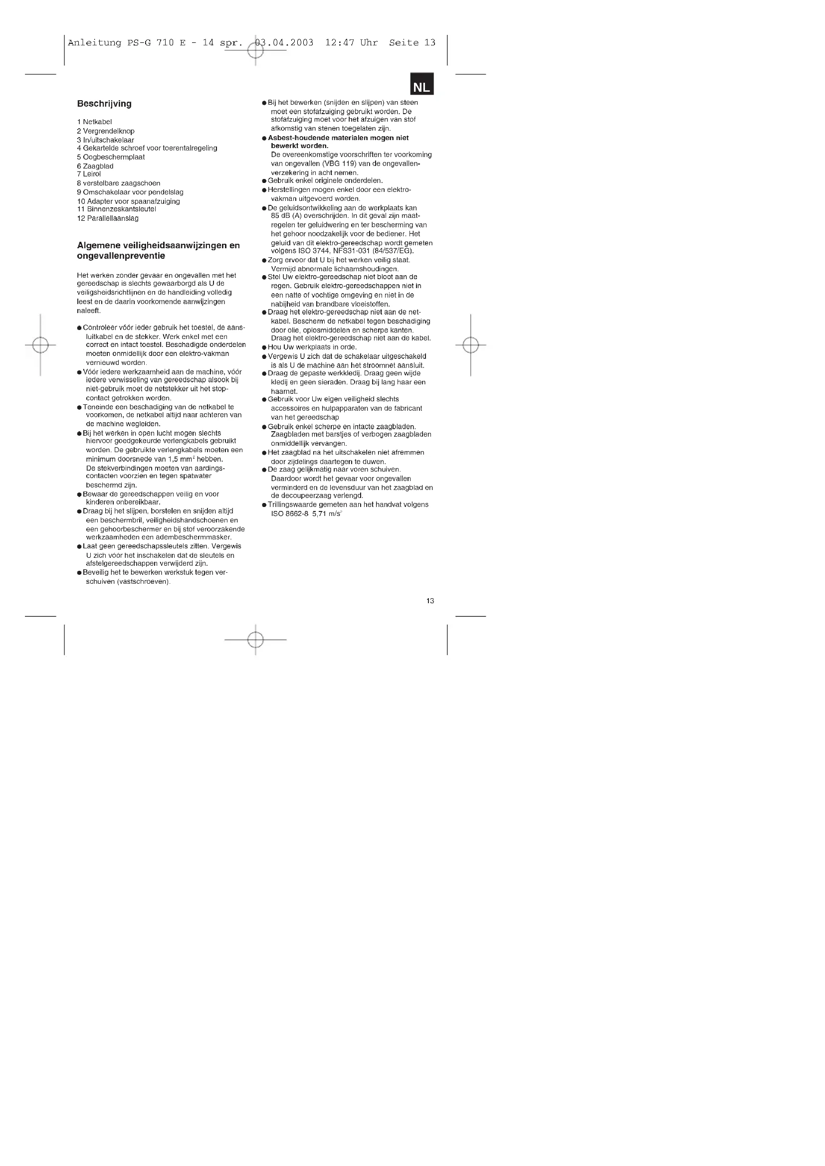 Switching on: Press the On/Off switchContinuous operation: Lock the On/Off switch with the locking buttonSwitching off: Press the On/Off switchand releaseInterrupteurMARCHE/ARRETBoutonPour augmenter le nombre de cycles parminute, tournez le régulateur de vitesse.Pour régler le sabot de sciage vers la gauche ou la droiteà un angle maximum de 45°, desserrez les deux vis.Réglage de la course pendulaire Anleitung PS-G 710 E - 14 spr. 03.04.2003 12:47 Uhr Seite 1213 Beschrijving 1 Netkabel 2 Vergrendelknop 3 In/uitschakelaar 4 Gekartelde schroef voor toerentalregeling 5 Oogbeschermplaat 6 Zaagblad 7 Leirol 8 verstelbare zaagschoen 9 Omschakelaar voor pendelslag 10 Adapter voor spaanafzuiging 11 Binnenzeskantsleutel 12 Parallellaanslag Algemene veiligheidsaanwijzingen en ongevallenpreventie Het werken zonder gevaar en ongevallen met het gereedschap is slechts gewaarborgd als U de veiligsheidsrichtlijnen en de handleiding volledig leest en de daarin voorkomende aanwijzingen naleeft. Controleer vóór ieder gebruik het toestel, de aans- luitkabel en de stekker. Werk enkel met een correct en intact toestel. Beschadigde onderdelen moeten onmidellijk door een elektro-vakman vernieuwd worden. Vóór iedere werkzaamheid aan de machine, vóór iedere verwisseling van gereedschap alsook bij niet-gebruik moet de netstekker uit het stop- contact getrokken worden. Teneinde een beschadiging van de netkabel te voorkomen, de netkabel altijd naar achteren van de machine wegleiden. Bij het werken in open lucht mogen slechts hiervoor goedgekeurde verlengkabels gebruikt worden. De gebruikte verlengkabels moeten een minimum doorsnede van 1,5 mm